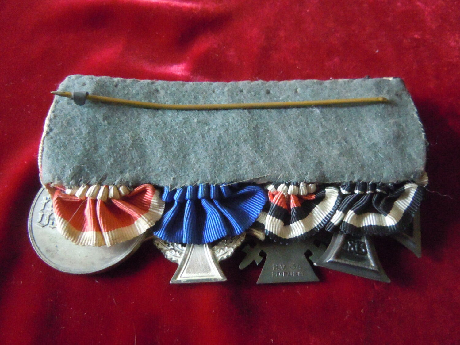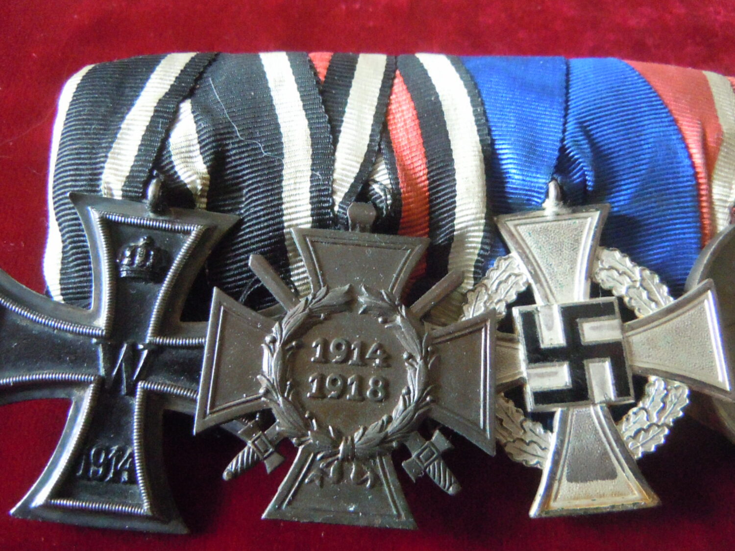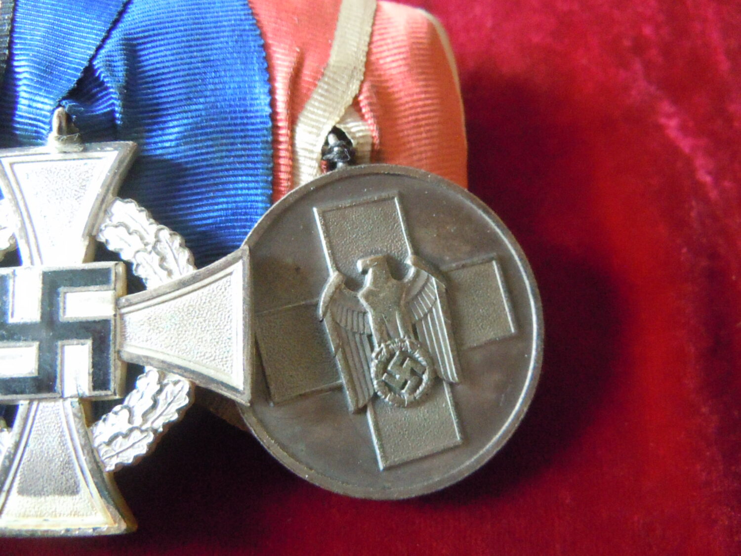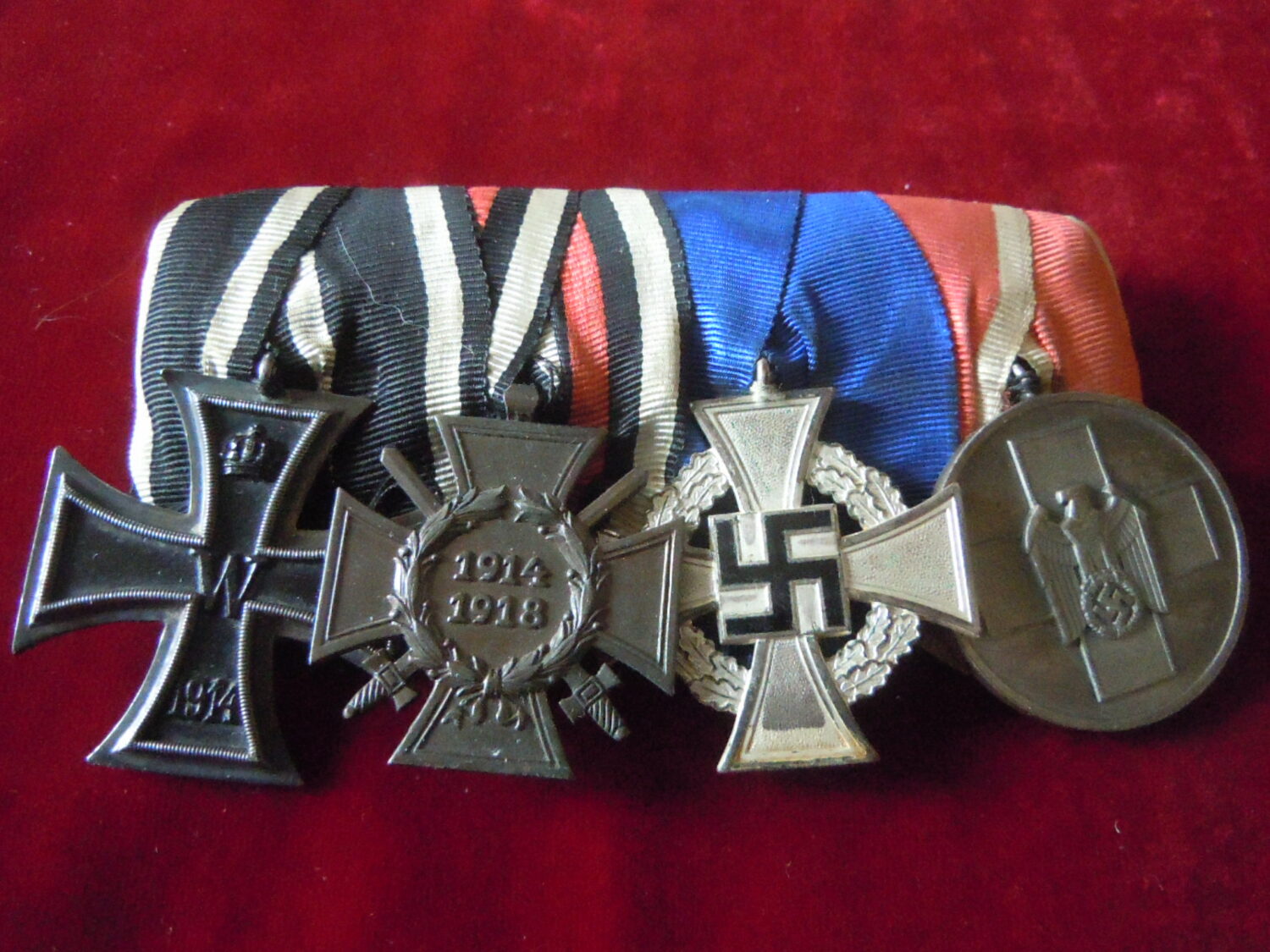 Barrette 4 médailles: croix de fer 1914, ehrenkreuz, médaille 25 ans de service, médaille für deutsche Volksplflege. Très bon état.