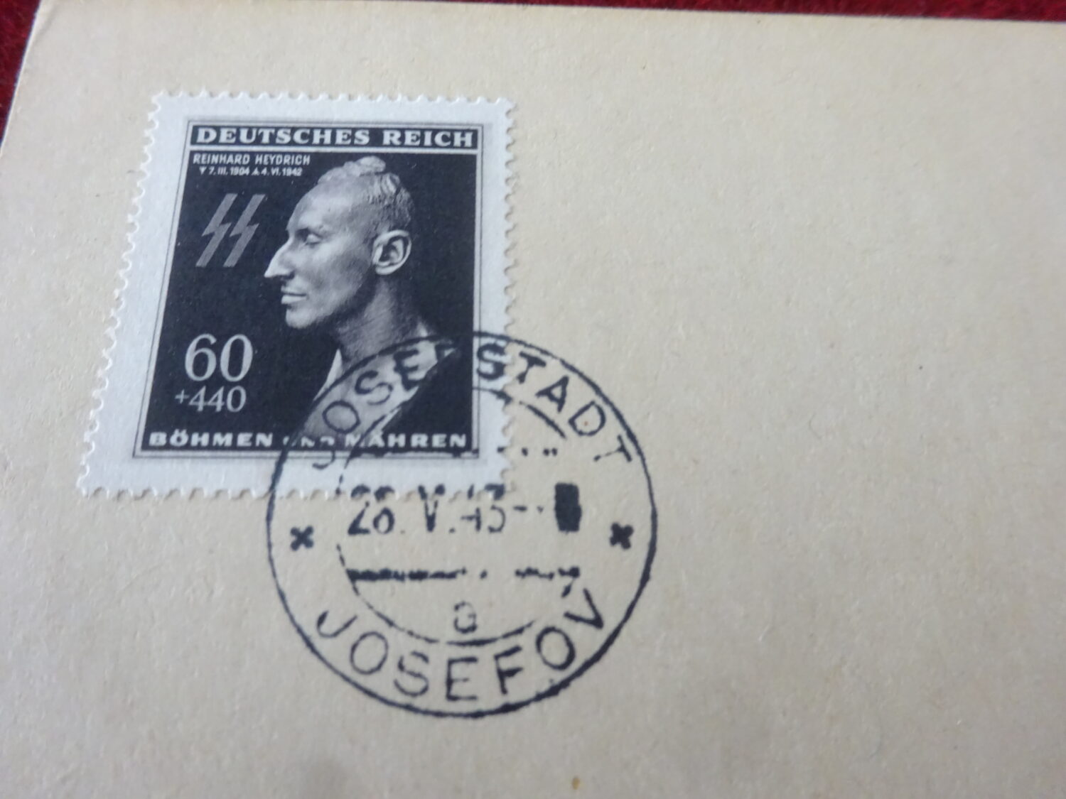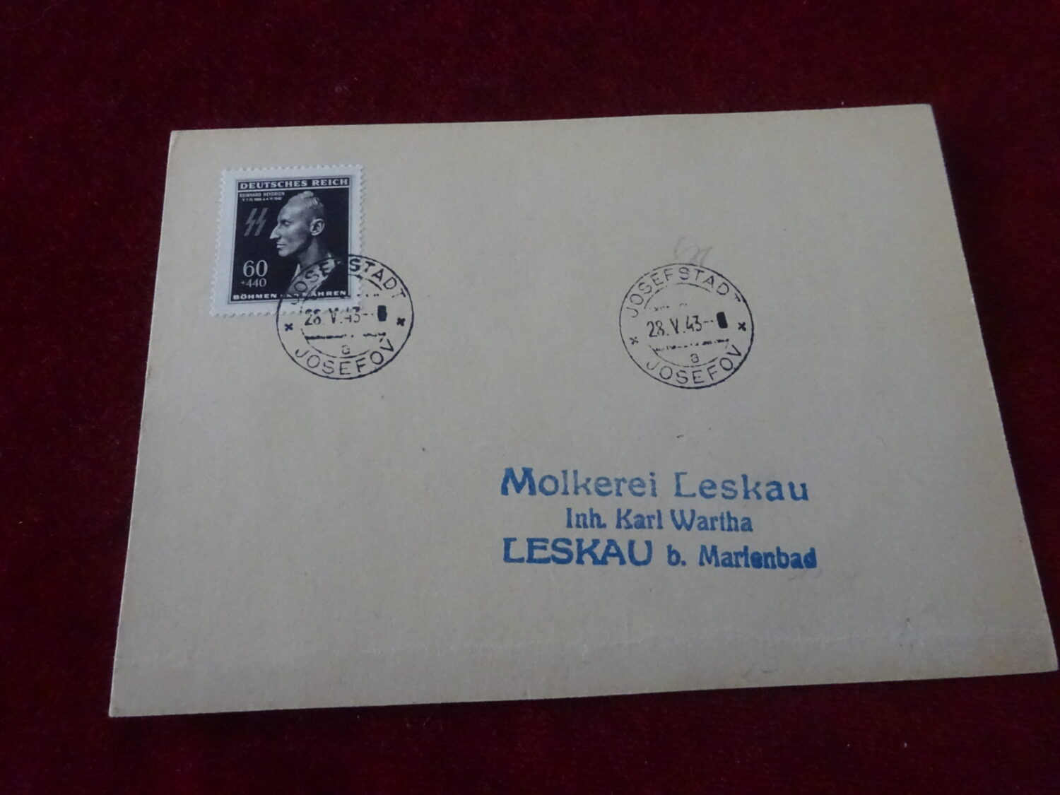 Carte avec timbre Reinhard Heydrich avec tampon en date du 28 mai 1943. Tampon Molkerei Leskau.
