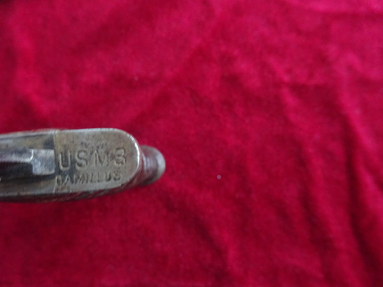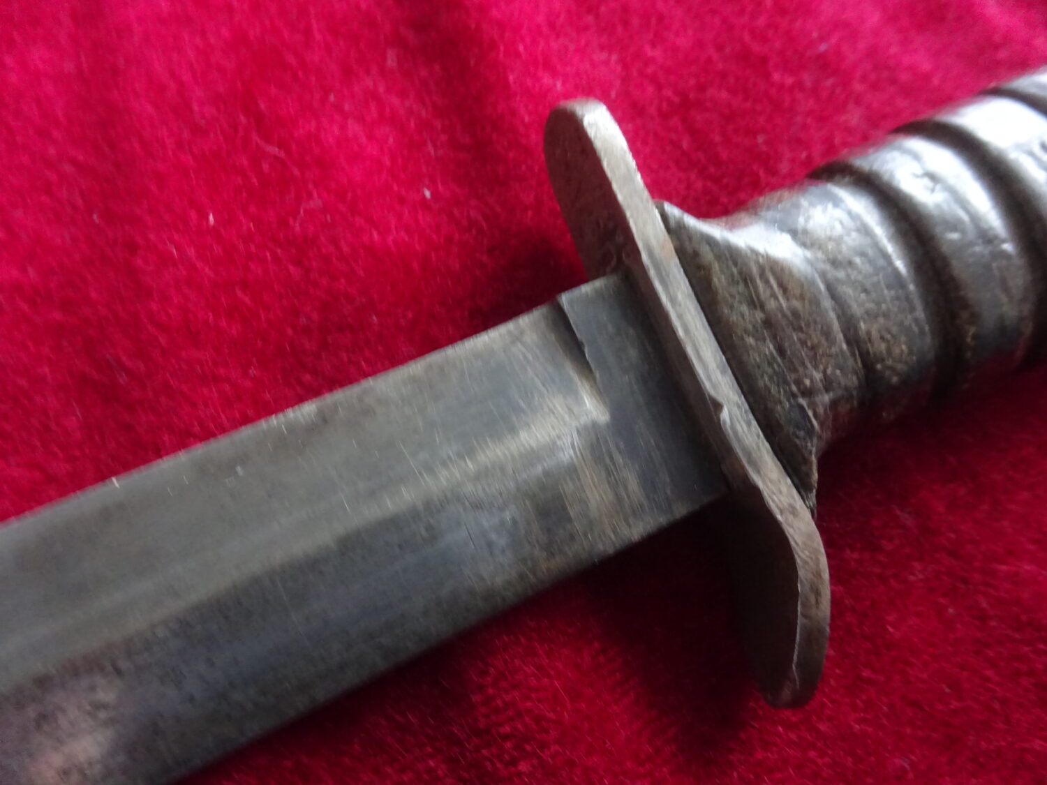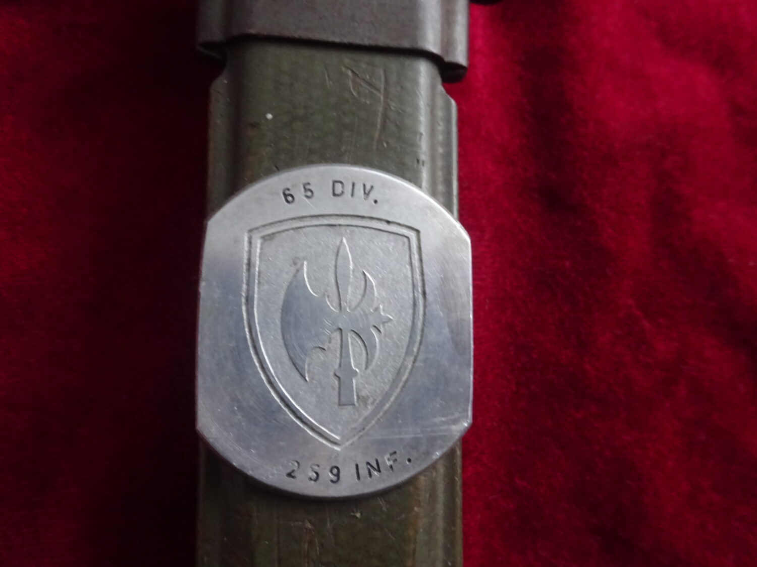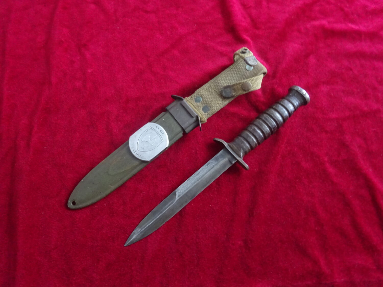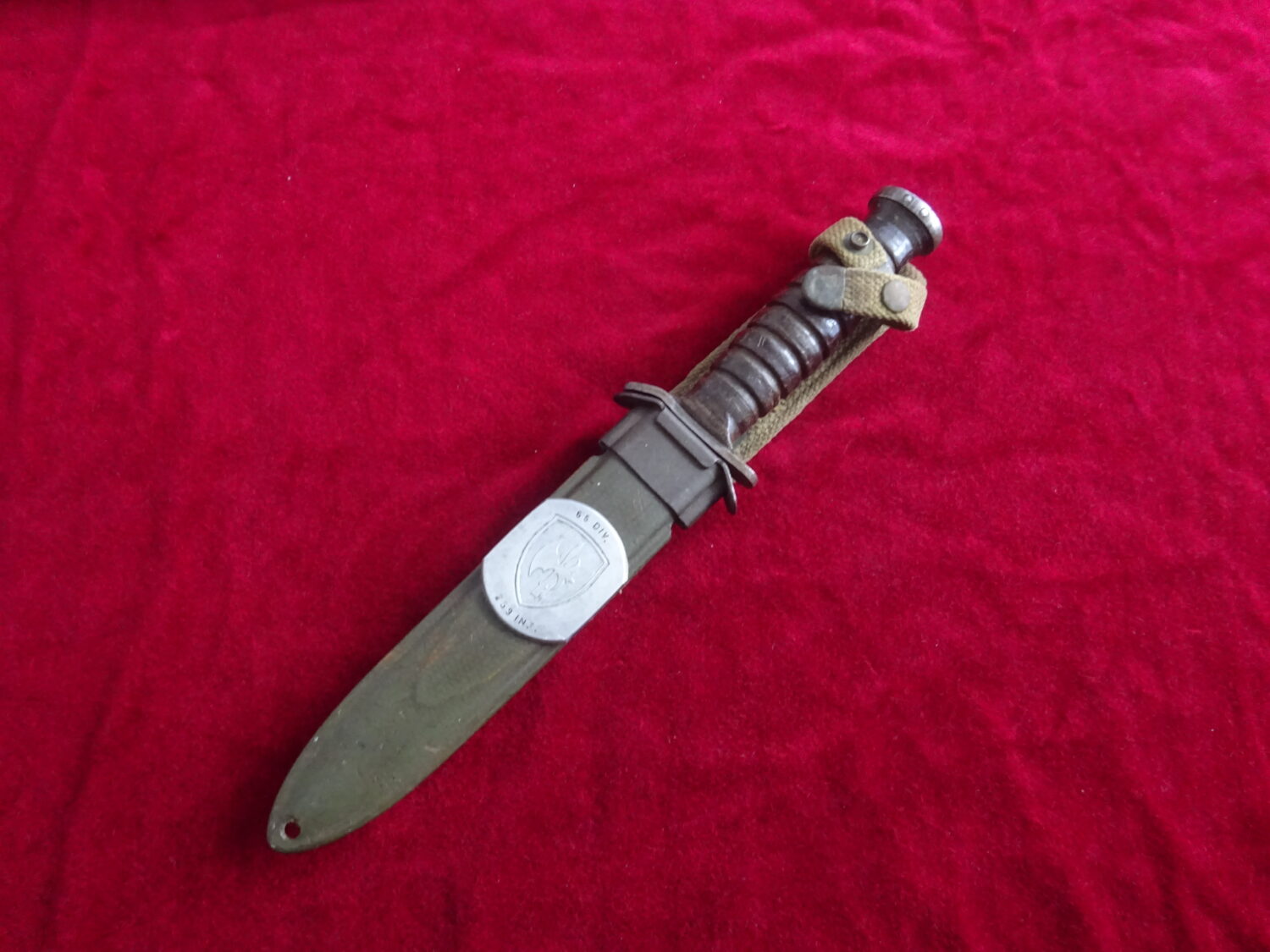 Couteau américain M3 Camillus marquage garde à 8 rondelles de 1944 avec son USM8 1er modèle . Unn badge du 259e IR déployé en allemande début 1945 est fixé au fourreau. Paiement possible en plusieurs versements sur demande.