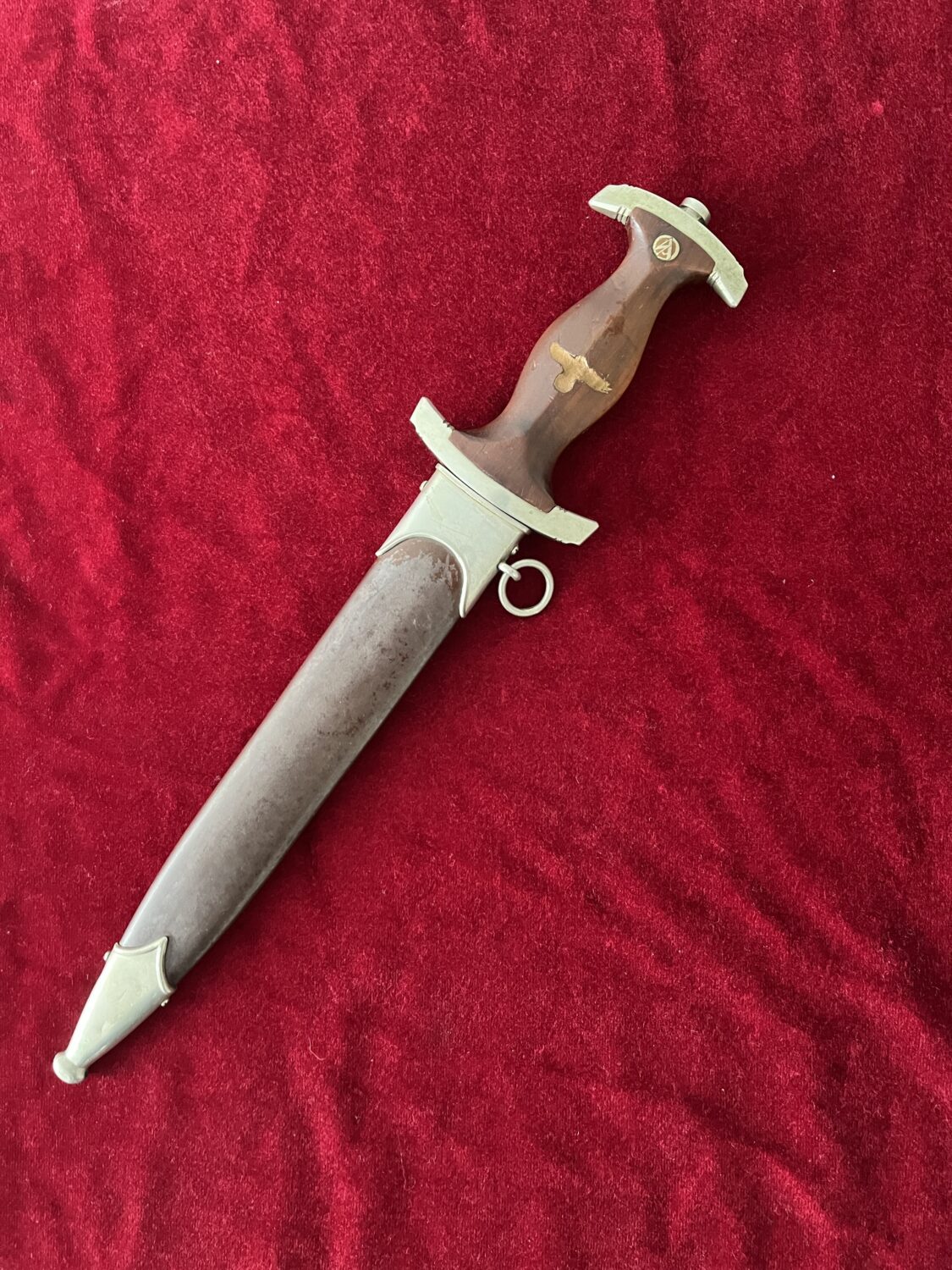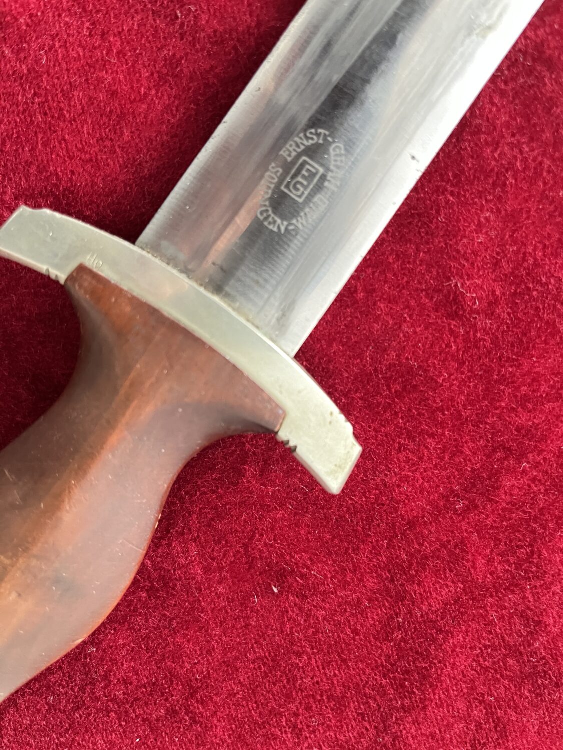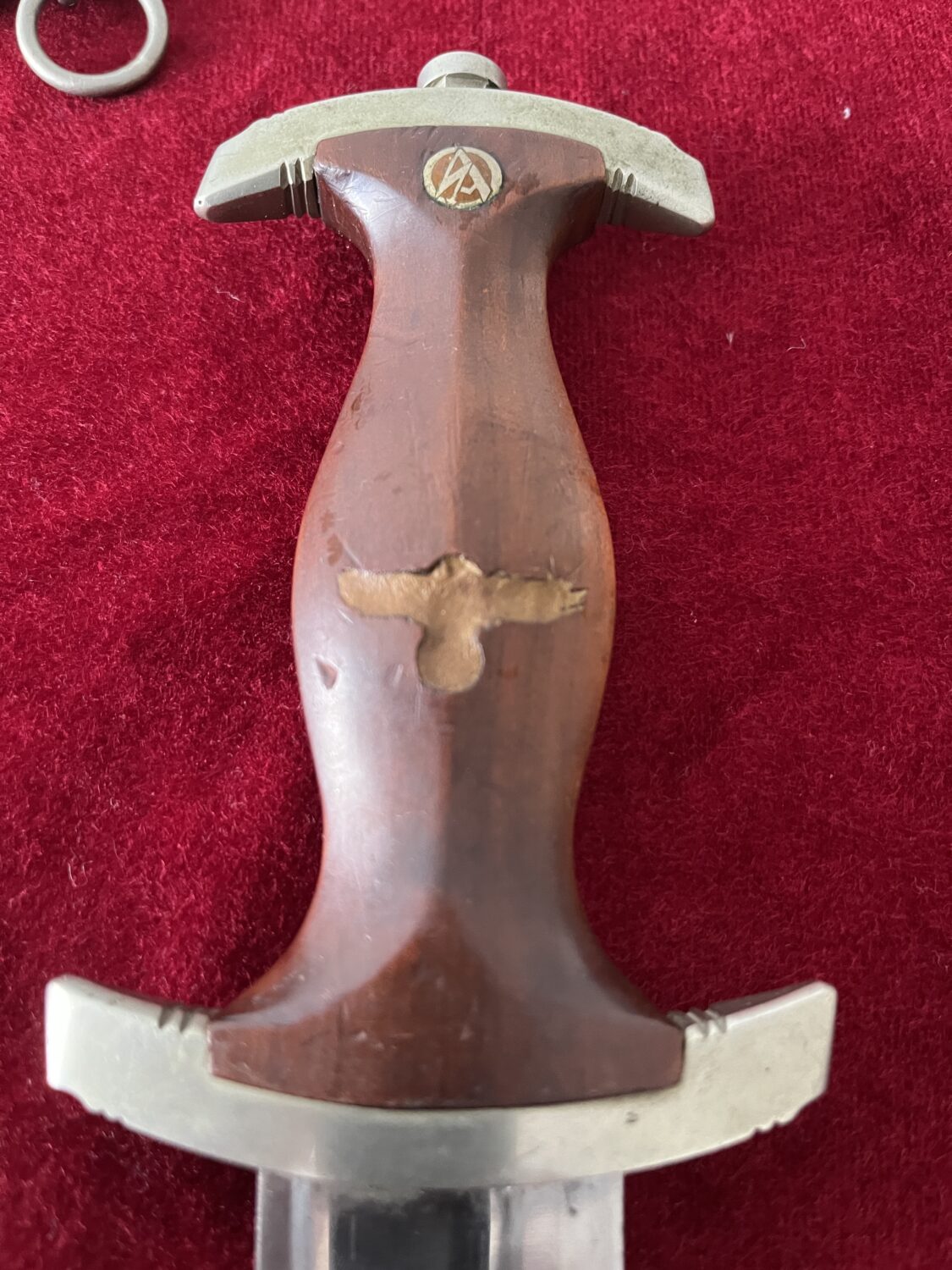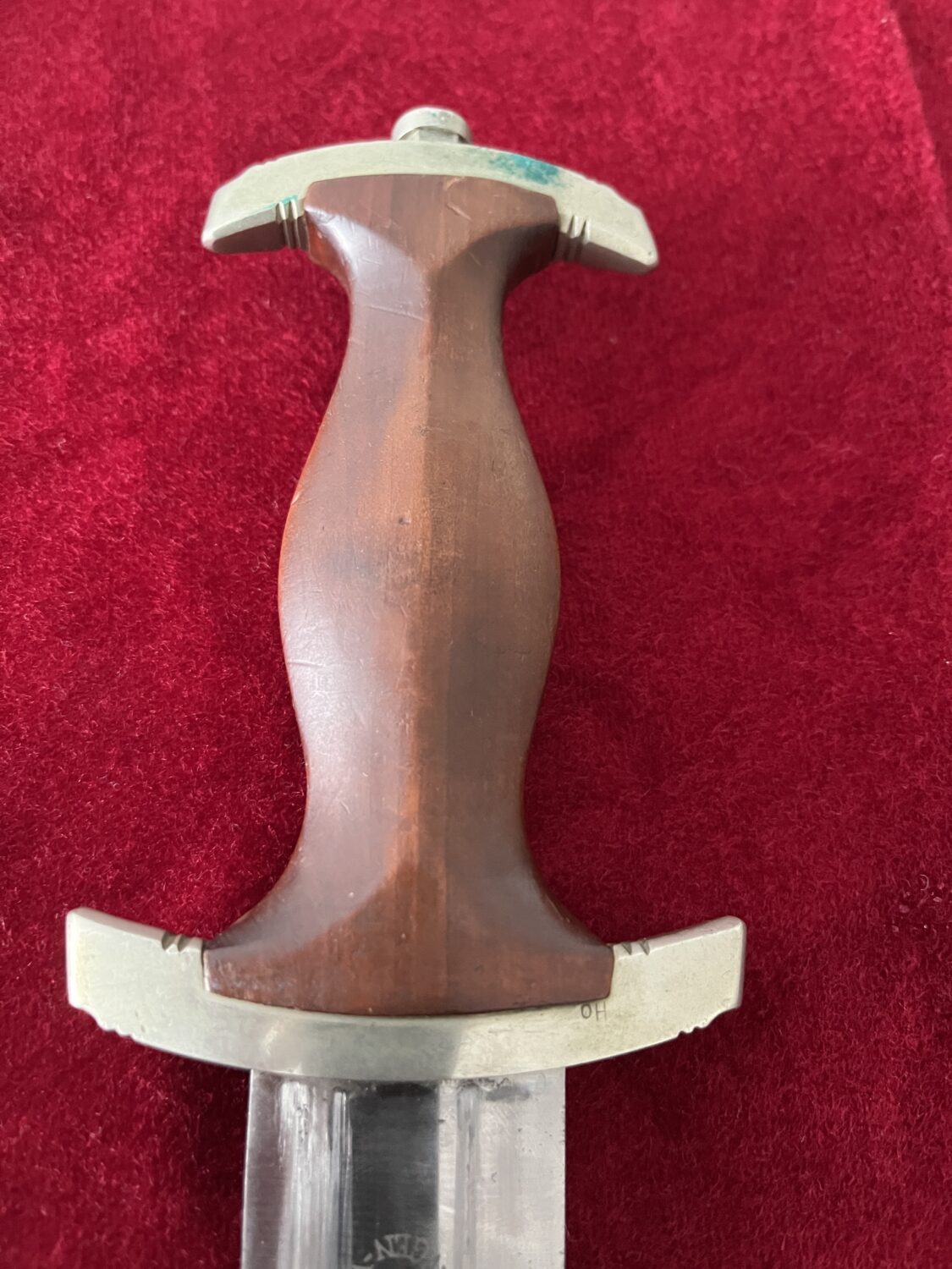 Dague SA. Fabricant Ernst Grah, Solingen. Ce fabricant est coté 9 sur 10 au niveau de la rareté (Mc Sarr) avec très peu de dagues produites. Hormis la dénazification avec le retrait de l’aigle le reste de la dague est en très bon état. Poinçon Ho (correspondant au Gau Hochland). Paiement possible en plusieurs versements sur demande.