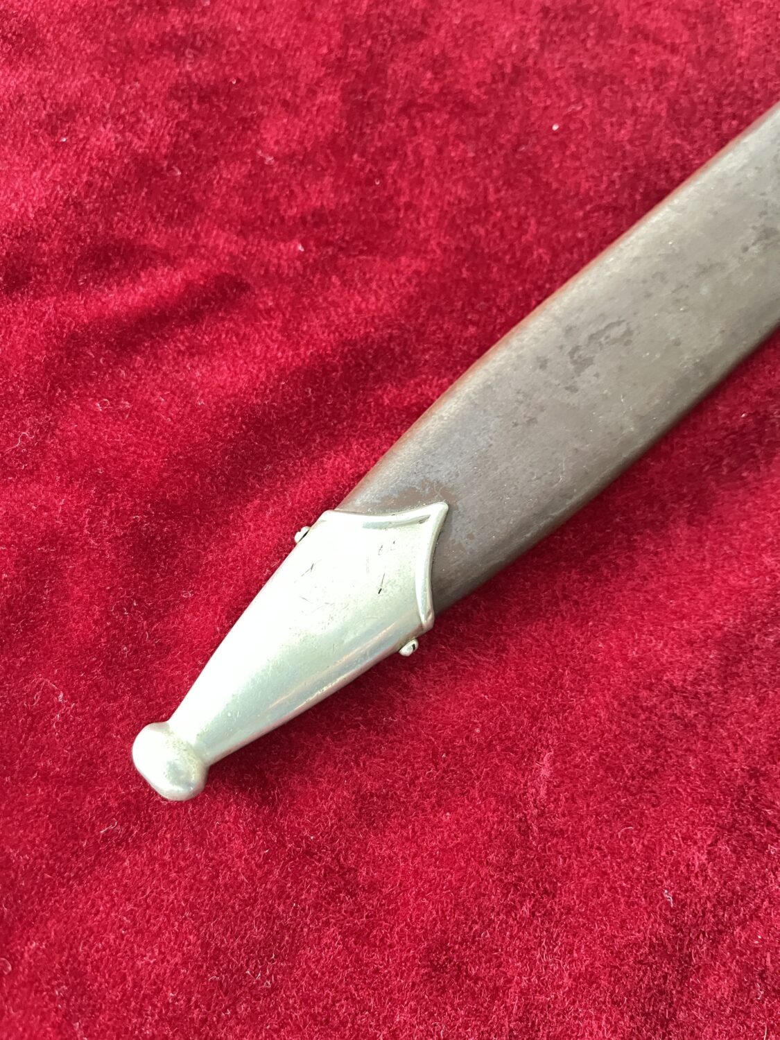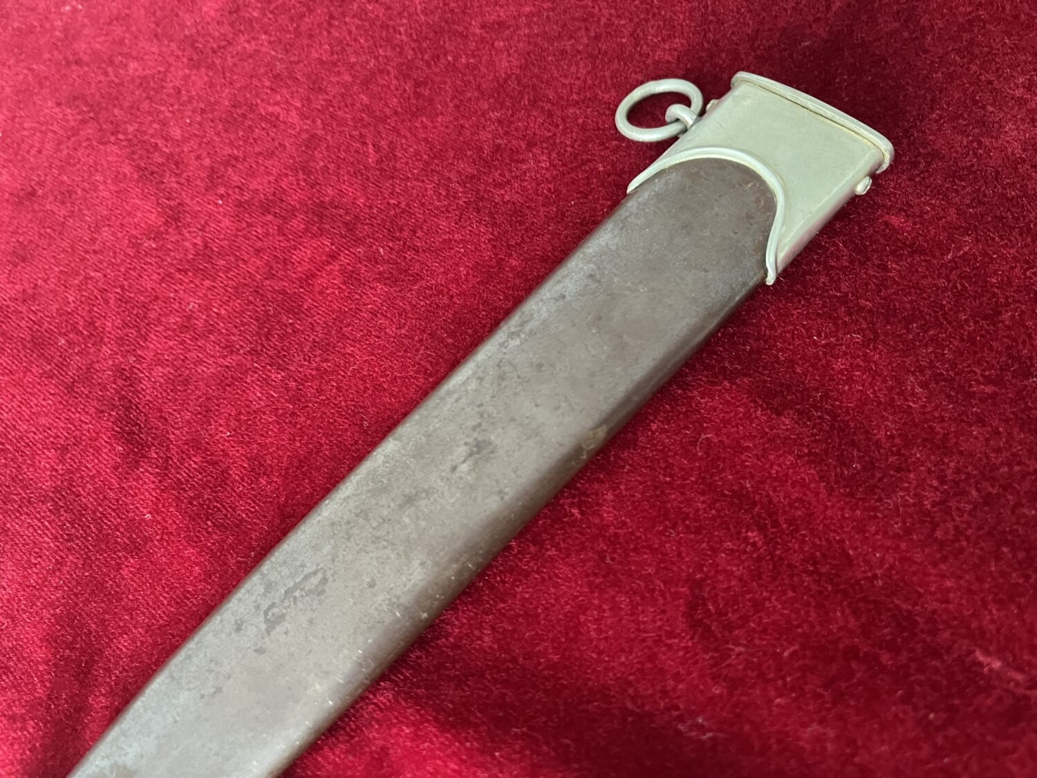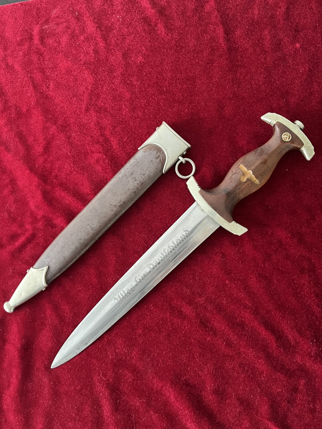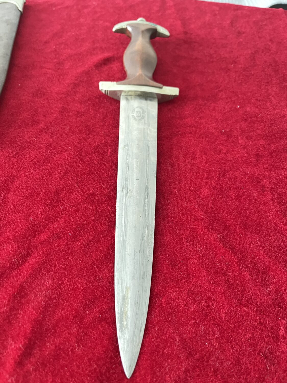 Dague SA. Fabricant Ernst Grah, Solingen. Ce fabricant est coté 9 sur 10 au niveau de la rareté (Mc Sarr) avec très peu de dagues produites. Hormis la dénazification avec le retrait de l’aigle le reste de la dague est en très bon état. Poinçon Ho (correspondant au Gau Hochland). Paiement possible en plusieurs versements sur demande.