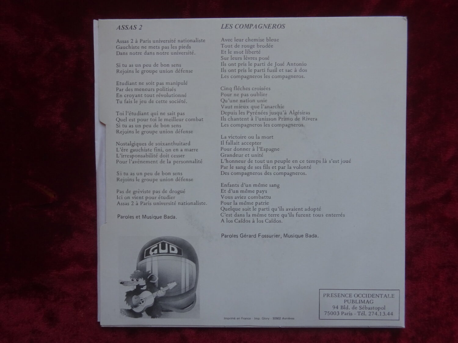 Disque 45 tours édité par le GUD (Groupe Union Défense) en 1980. Tirage seulement 1000 exemplaires. Exemplaire neuf.