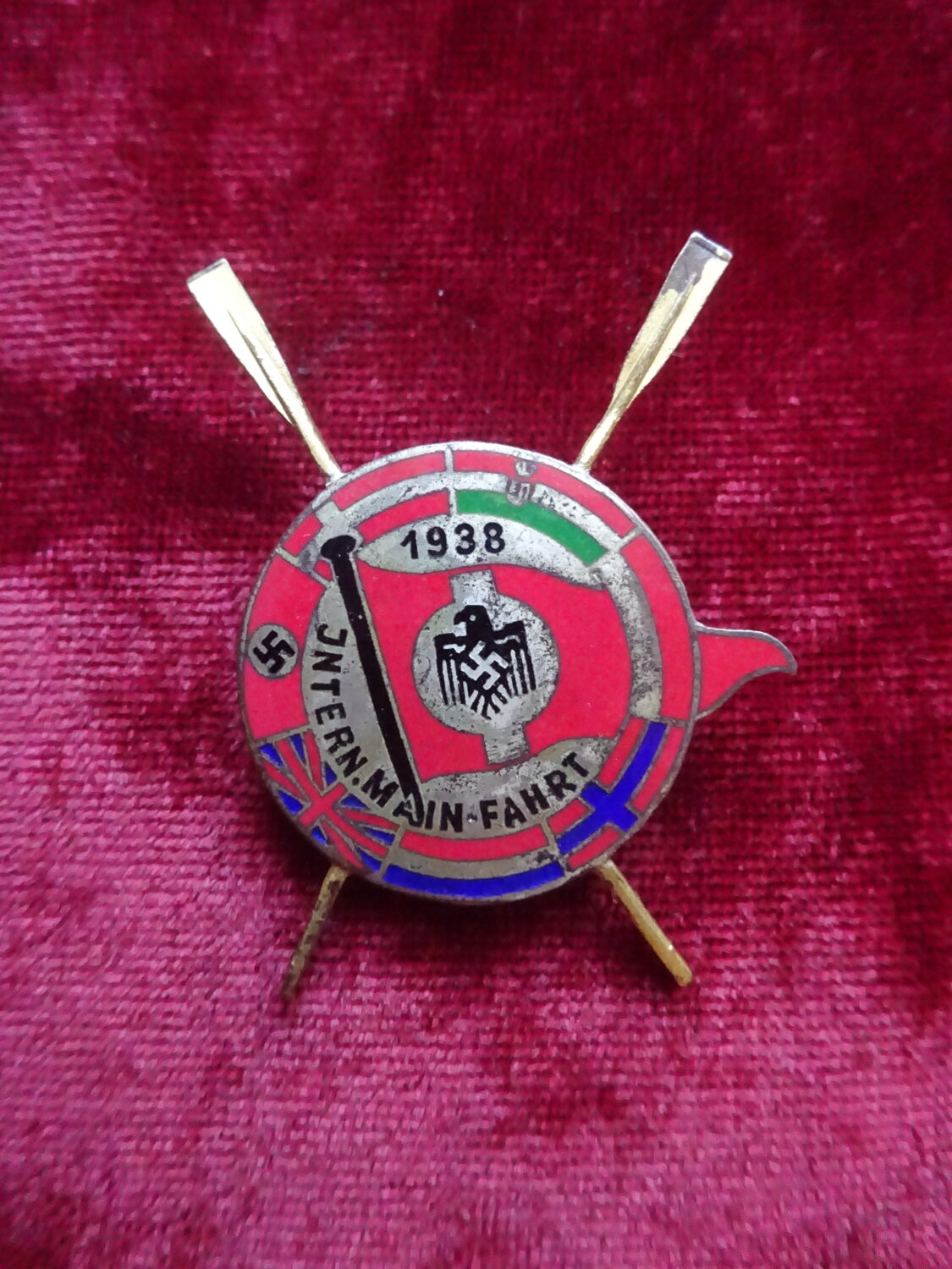 Insigne commémoratif pour la compétition de régate d’aviron »Internationale Main-Fahrt 1938″ qui s’est déroulée à Francfort-sur-le-Main, en Allemagne. Hauteur 4,5 cm, largeur 3,5 cm.Très rare.