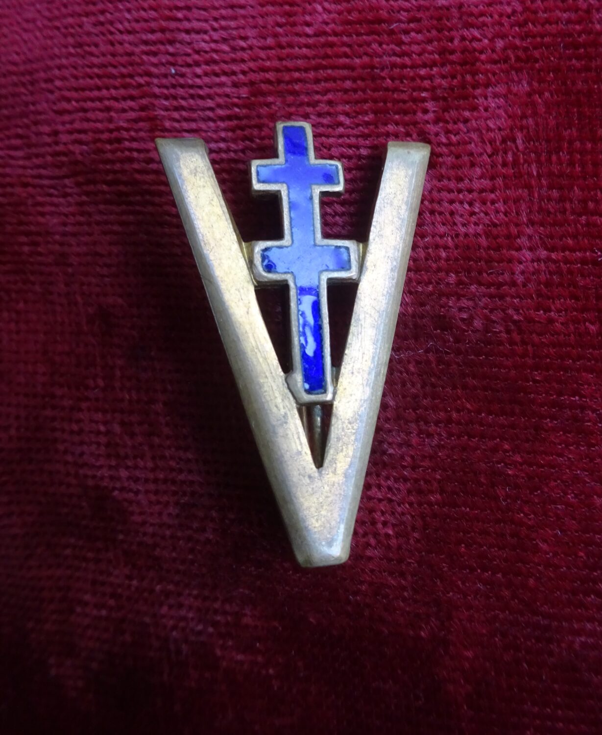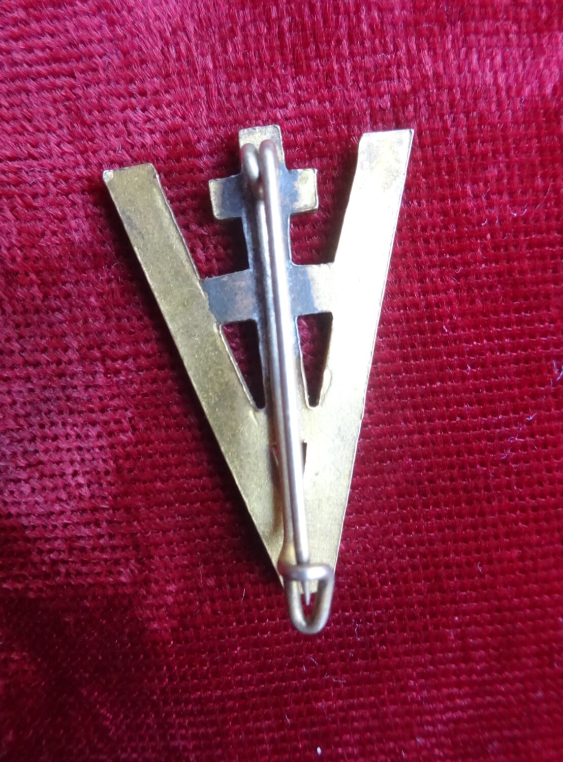 Insigne patriotique de la Libération fabriquée en 1944 et 1945. Il combine deux symboles patriotiques majeurs de l’époque: La Croix de Lorraine symbole d ela France Libre dirigée par le général de Gaulle et le V de la victoire. Très bon état.