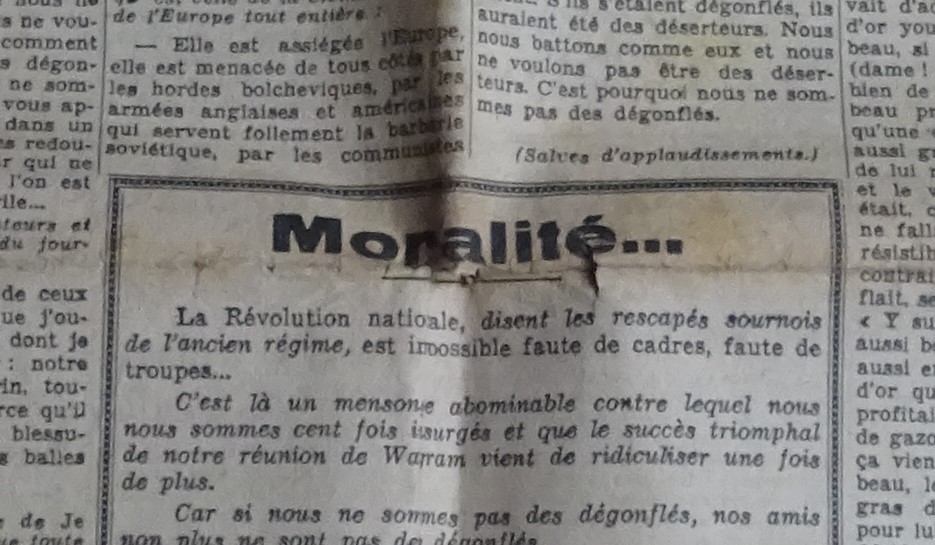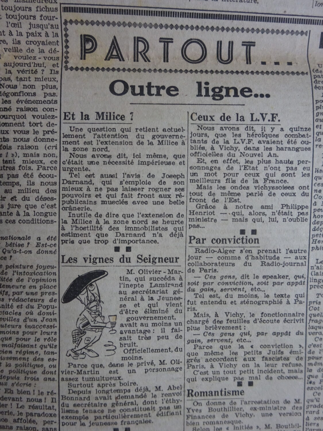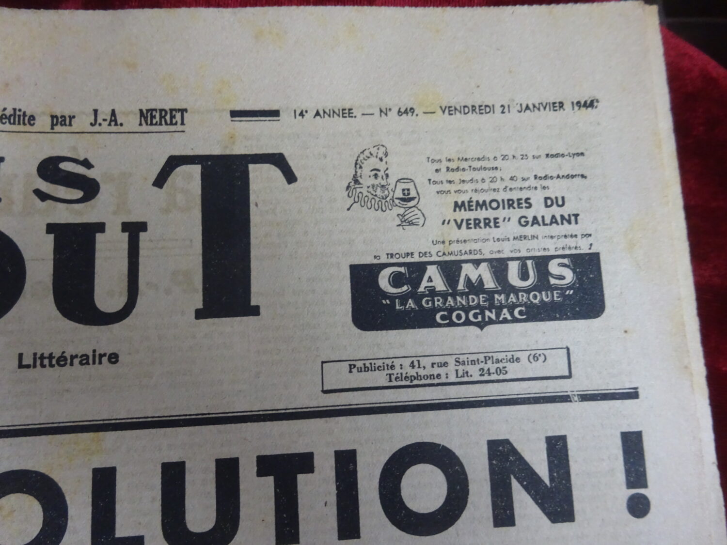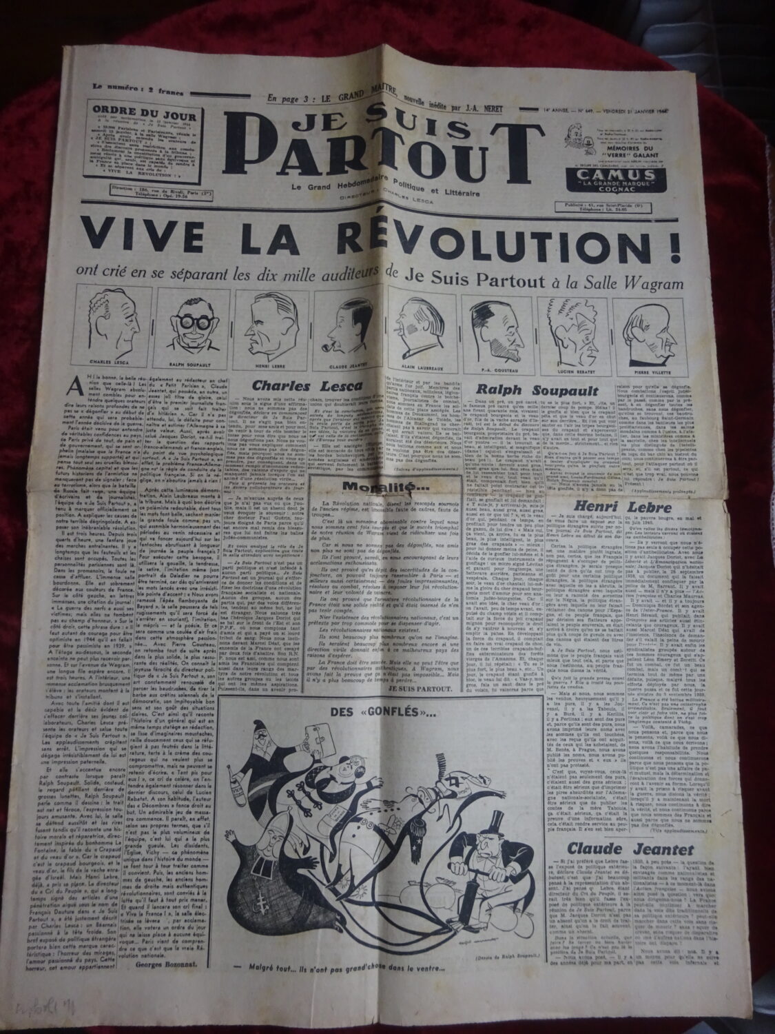 Journal Je Suis Partout 21 janvier 1944. Assez bon état. Usure au centre (pliure). Grand format 43 x 60 cm. 6 pages.