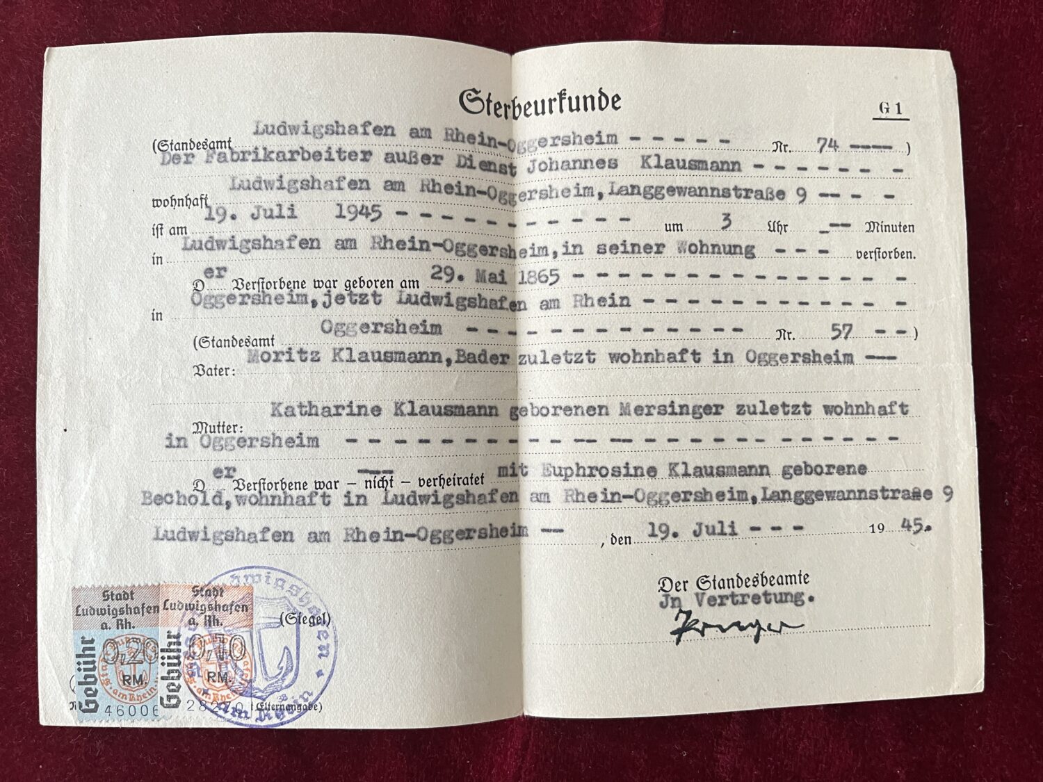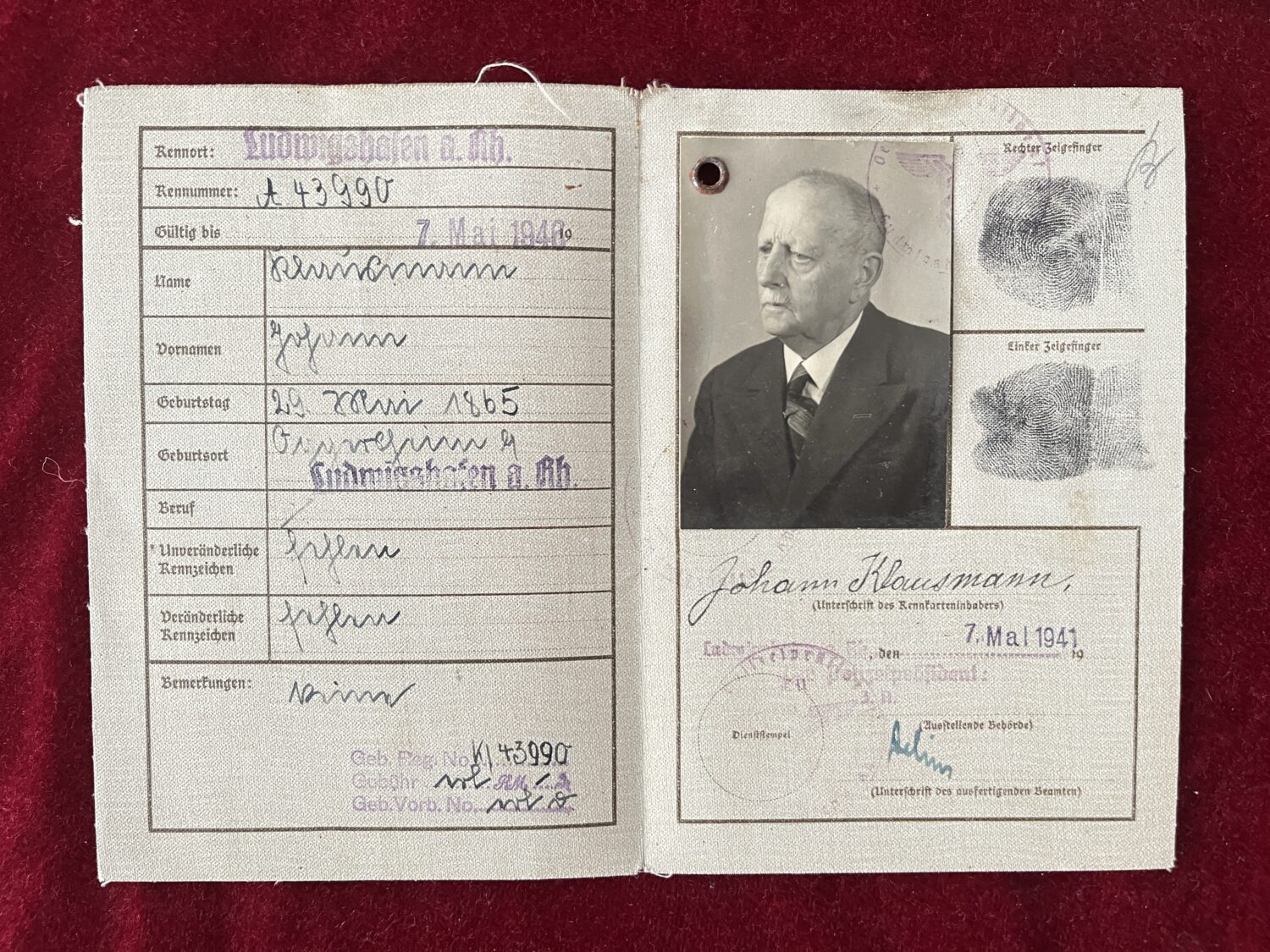 Deutsche Reich Kennkarte au nom de Johannes Klausmann avec également son certificat de décès.