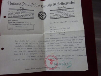 Lot de documents au nom de Josef Ballof né le 13 juin 1905 comprenant un livret d’adhérent au NSDAP période 1941-1944, un insigne du NSDAP marquage M1/34 (fabricant Karl Wurster), 1 wherpas établi le 22 février 1940, un livret du DAF période 1943-1944 et plusieurs documents.