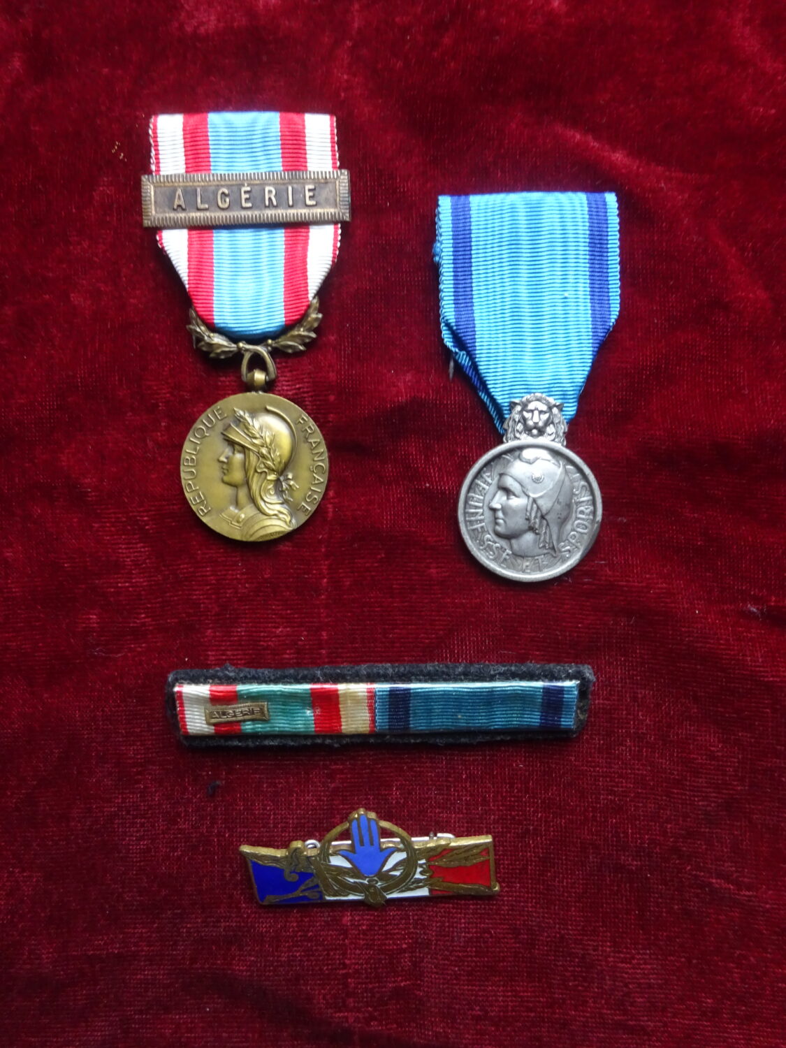 Lot comprenant la médaille commémorative des opérations de sécurité et de maintien de l’ordre en Algérie avec sa barrette de rappel, l’insigne des Forces Françaises en Afrique du Nord et la médaille de la jeunesse et des sports. Ensemble en bon état.