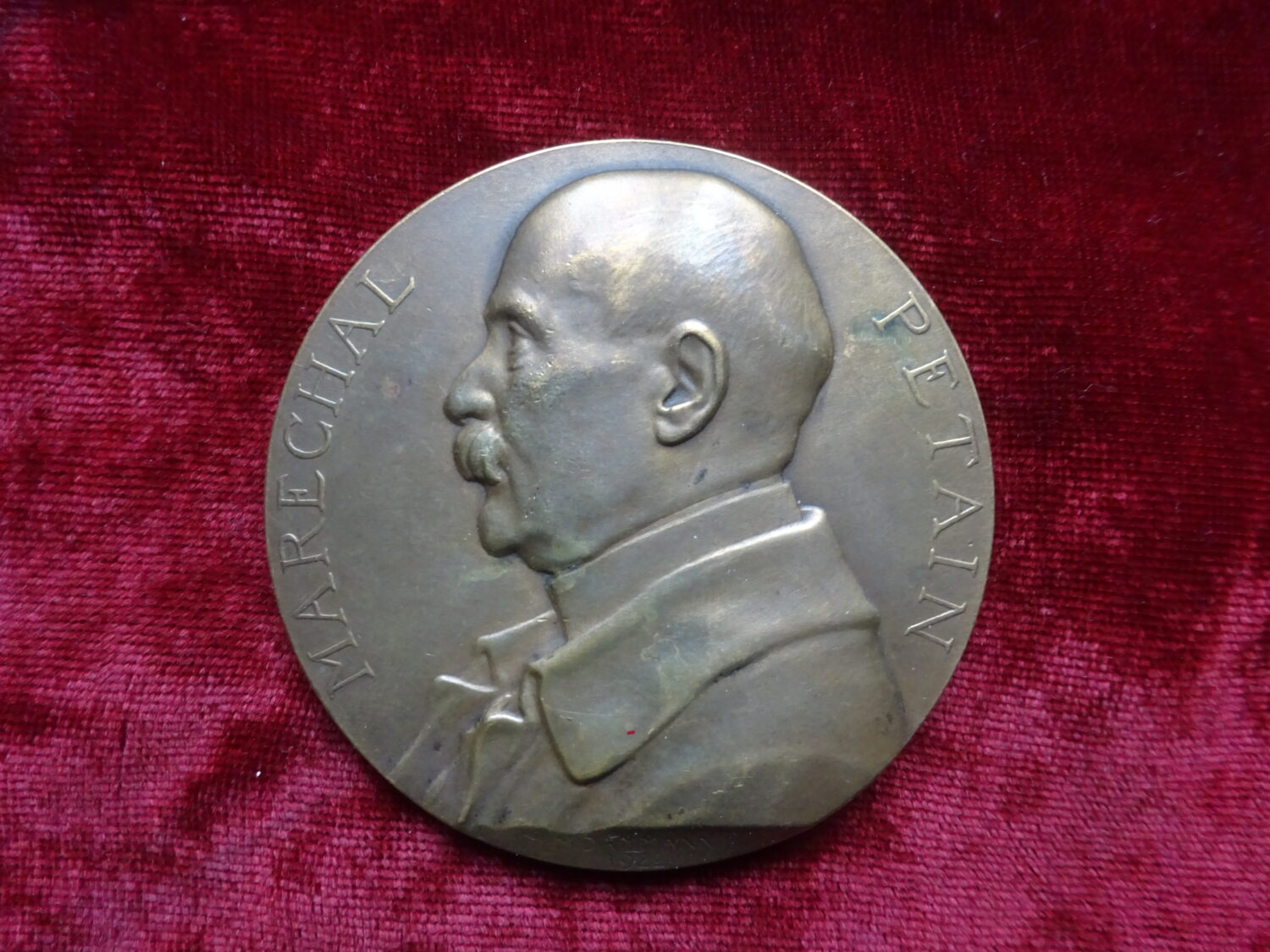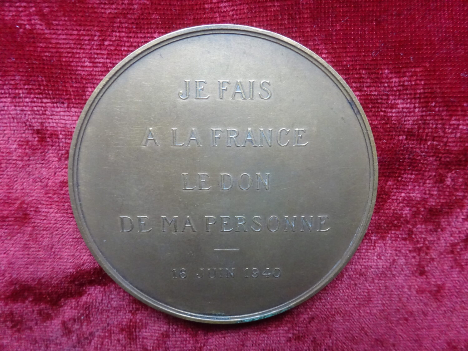 Médaille de table Philippe Pétain avec l’inscription au dos Je fais don à la France de ma personne. 16 juin 1940. Marquage sur la tranche. Poids 138 grammes. Diamètre: 6,7 cm. Bon état.