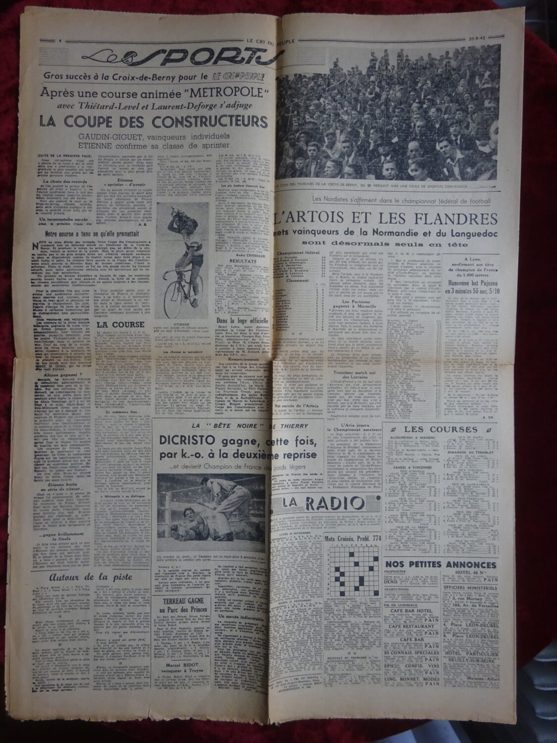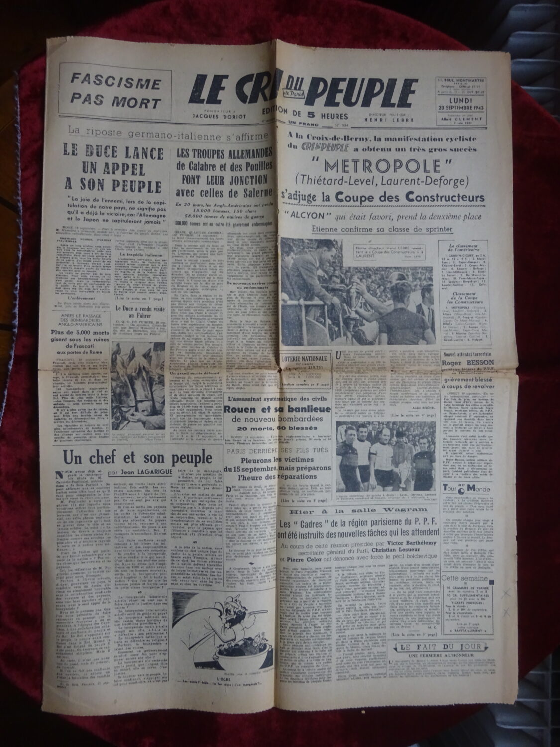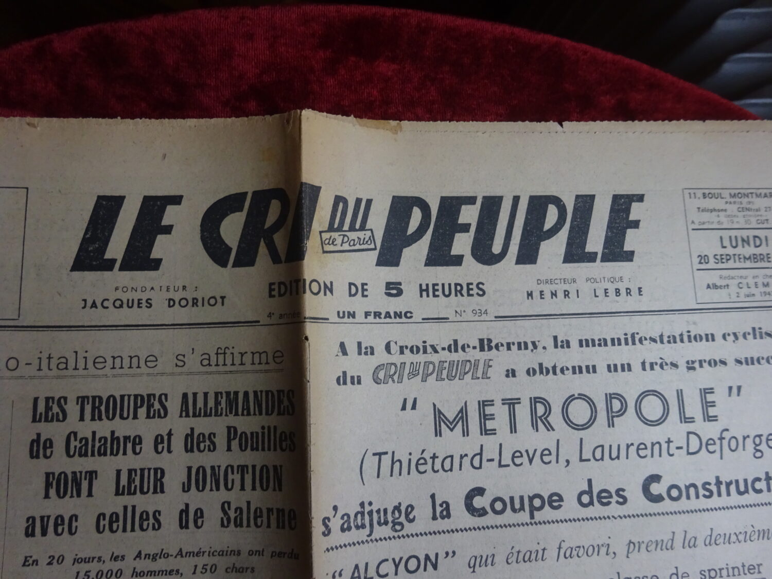 Quotidien Le Cri du Peuple 20 septembre 194 (PPF de Jacques Doriot). 4 pages.