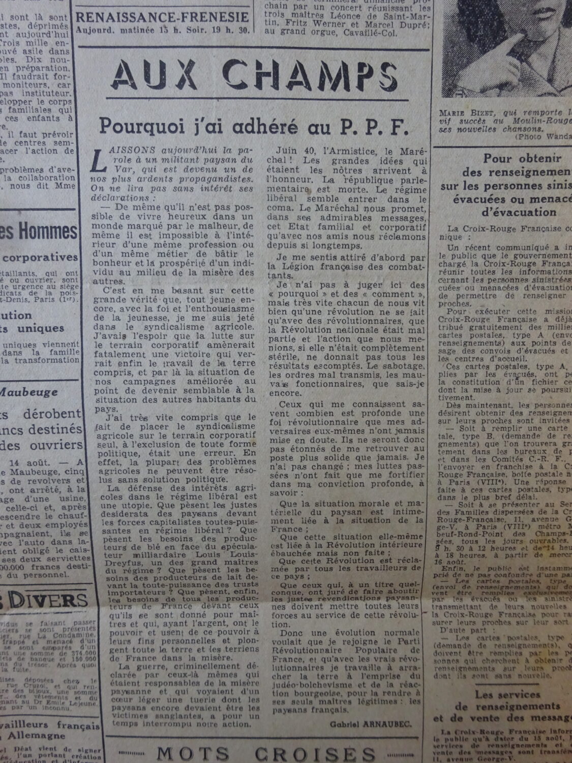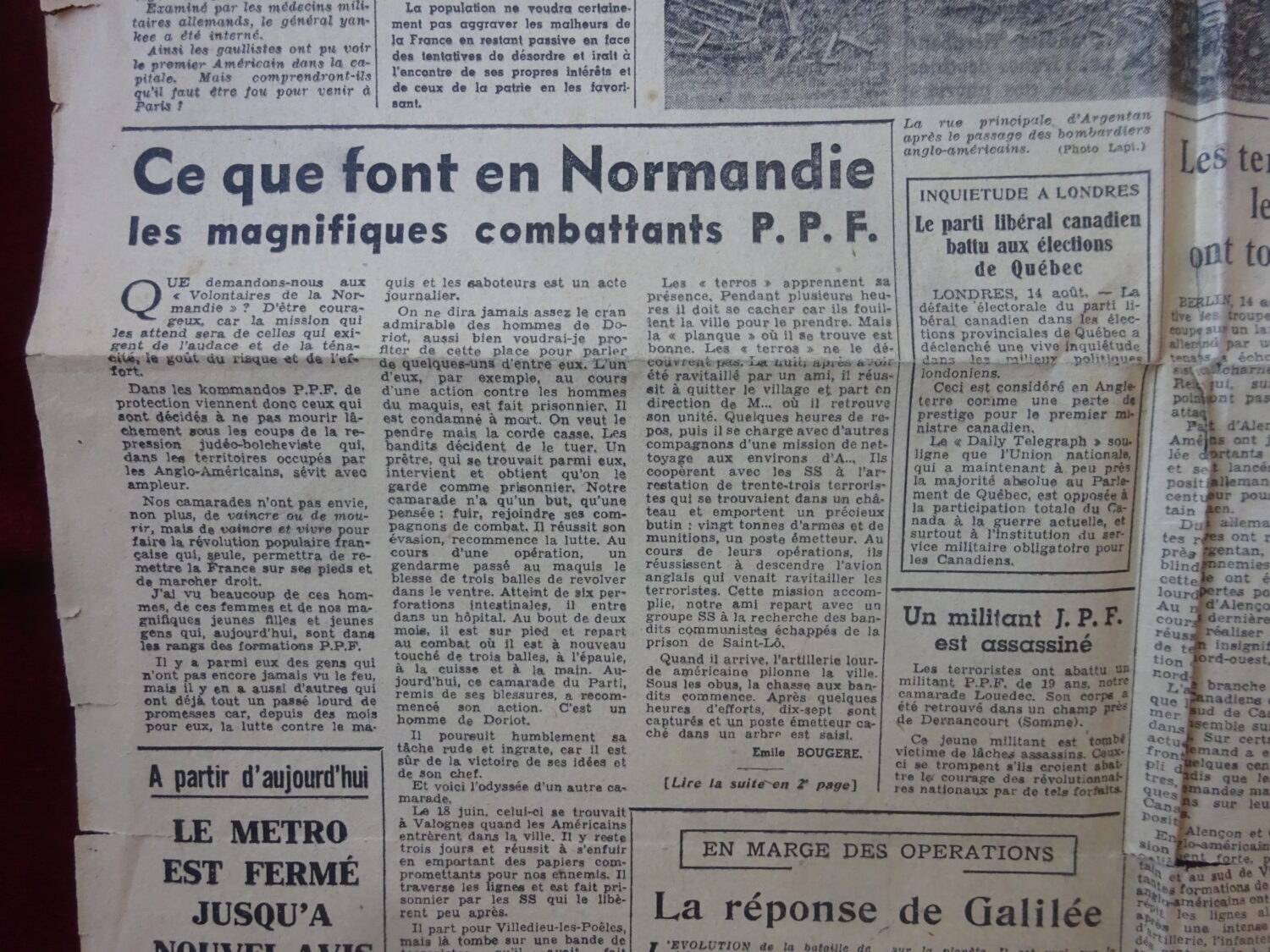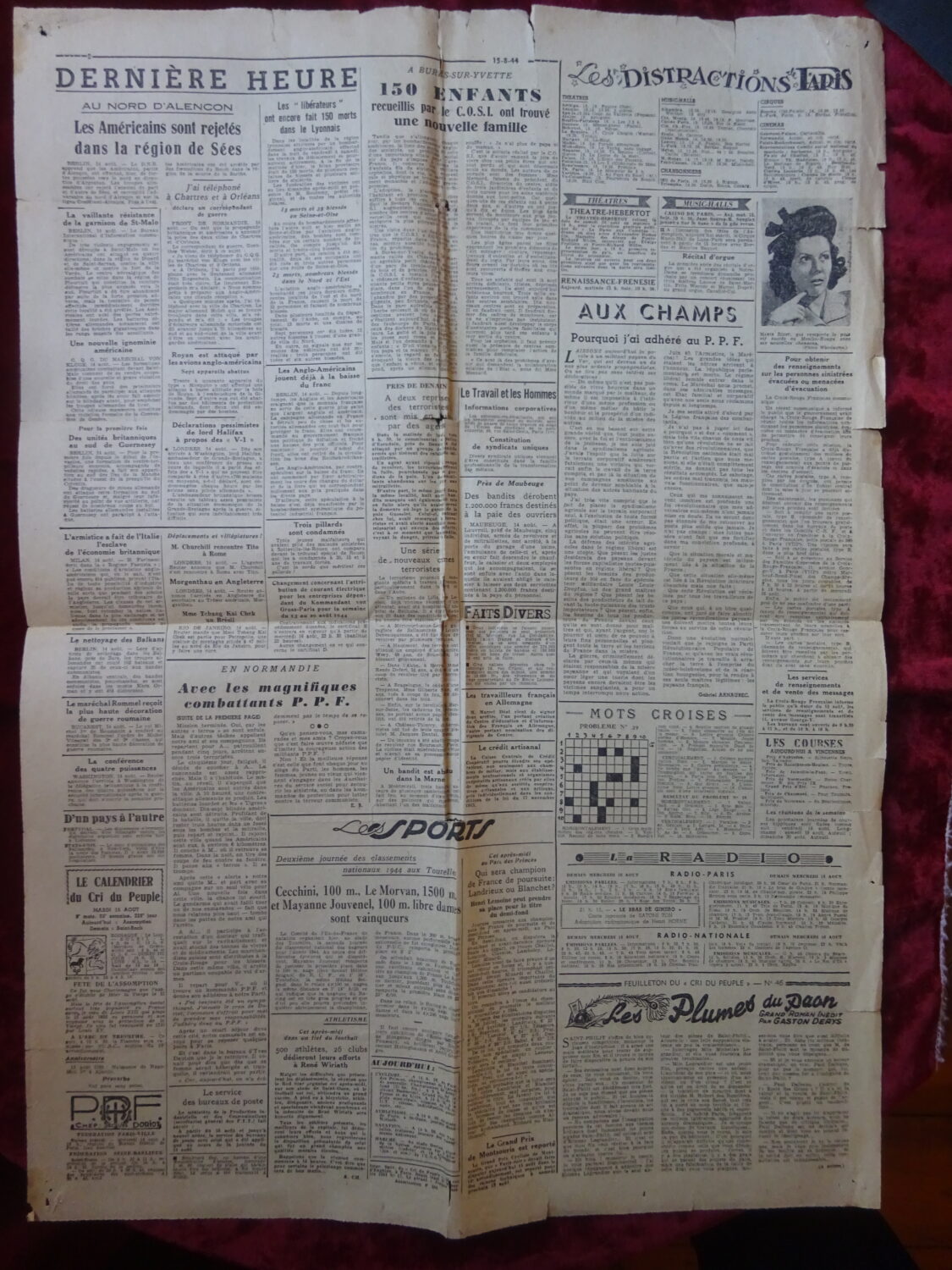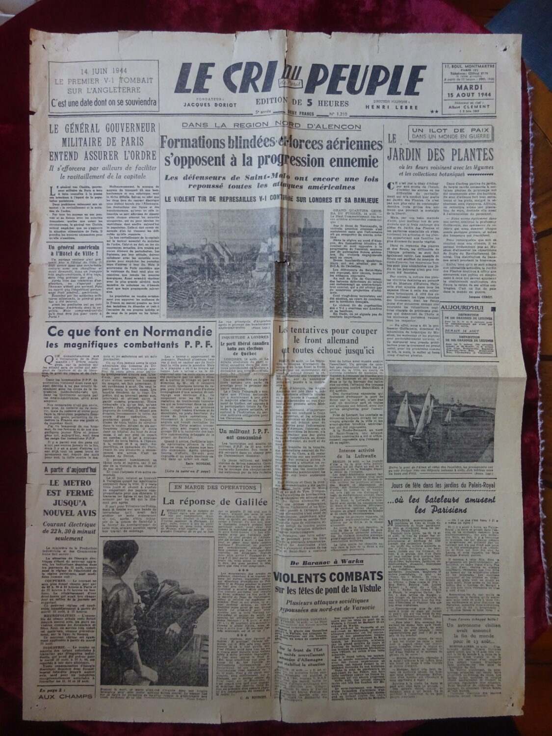 Quotidien Le Cri du Peuple de Jacques Doriot. Numéro du 15 aout 1944. Etat voir photos.
