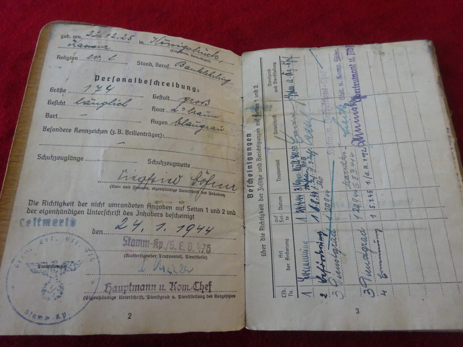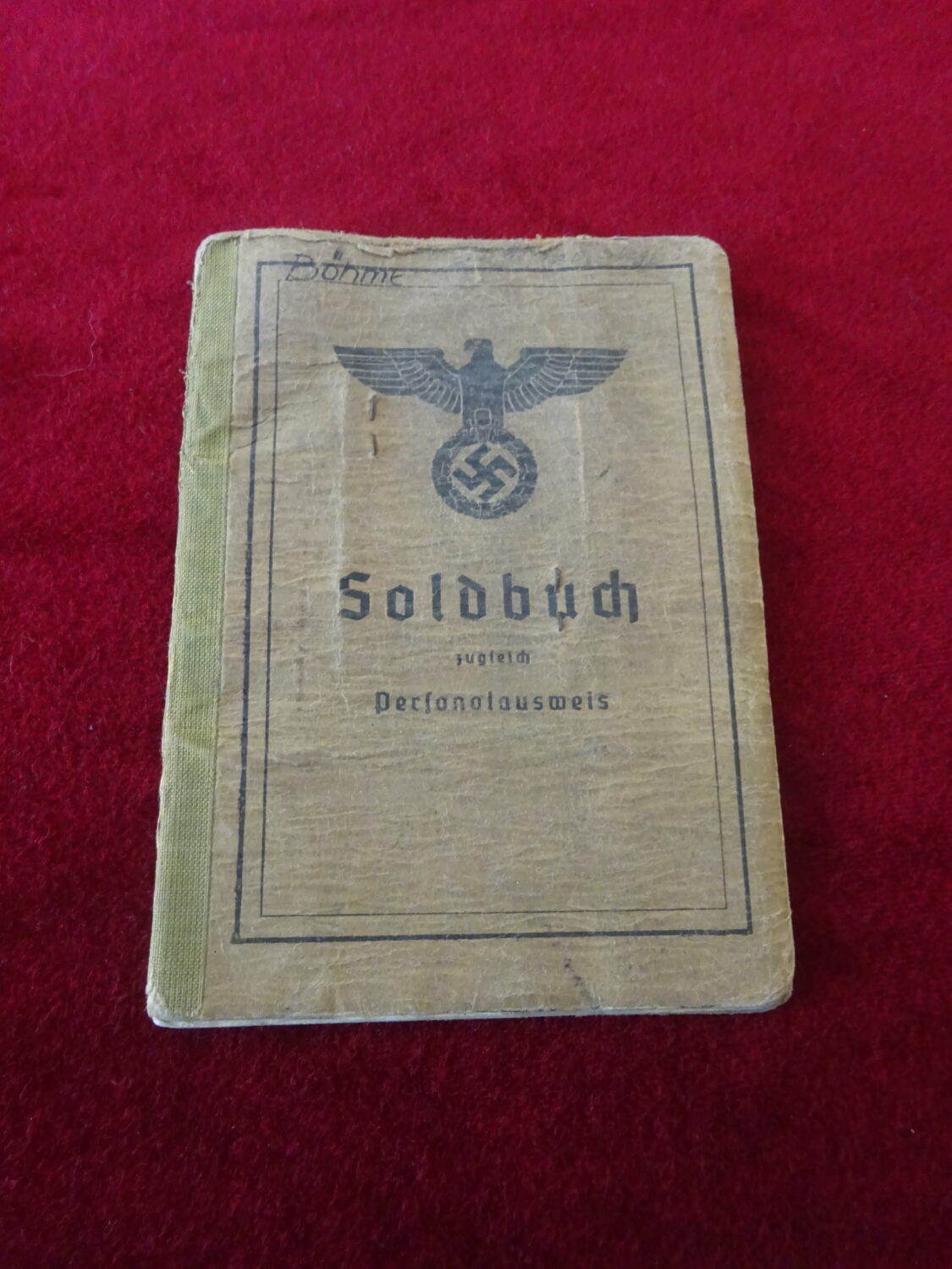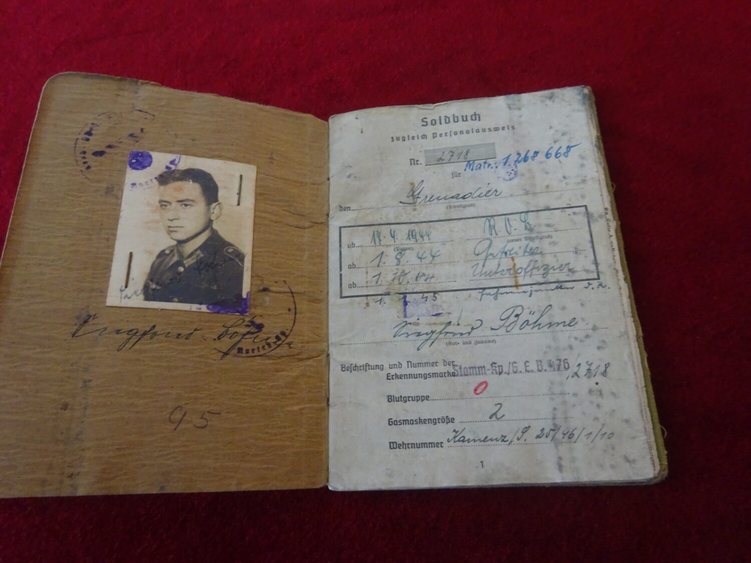 Soldbuch au nom de Siegfried Bohme, grenadier. Il est affecté tout d’abord au Grenadier Rgt.1096 (548 Volks Grenadier Division).  Campagnes: 1:URSS (1944) combats en Lituanie. 2:Allemagne (1944-1945) combat de défense de la ville de Tilsit en Prusse orientale.