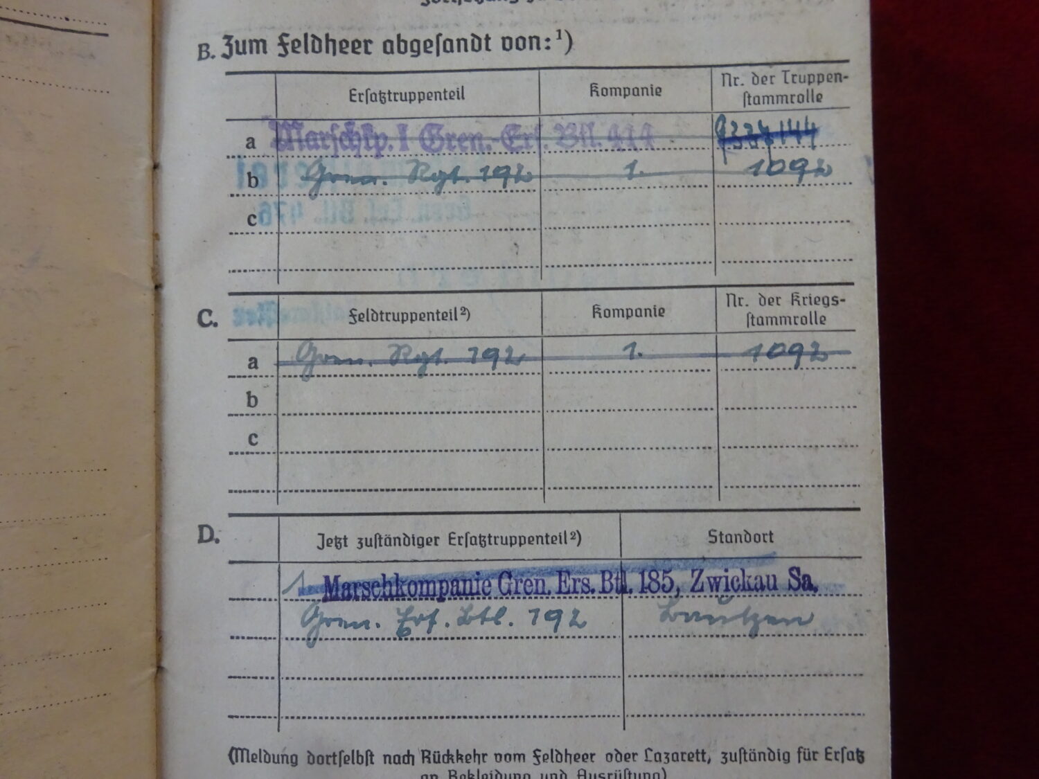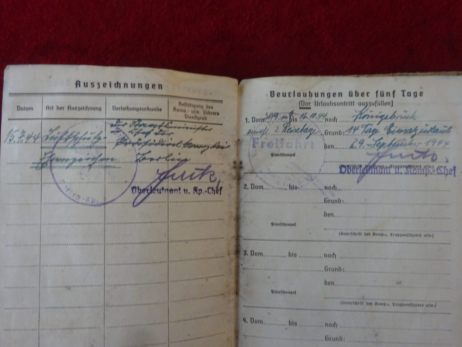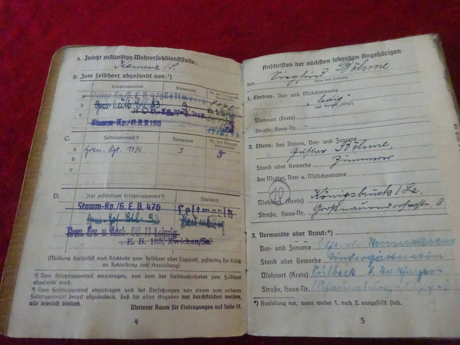 Soldbuch au nom de Siegfried Bohme, grenadier. Il est affecté tout d’abord au Grenadier Rgt.1096 (548 Volks Grenadier Division).  Campagnes: 1:URSS (1944) combats en Lituanie. 2:Allemagne (1944-1945) combat de défense de la ville de Tilsit en Prusse orientale.