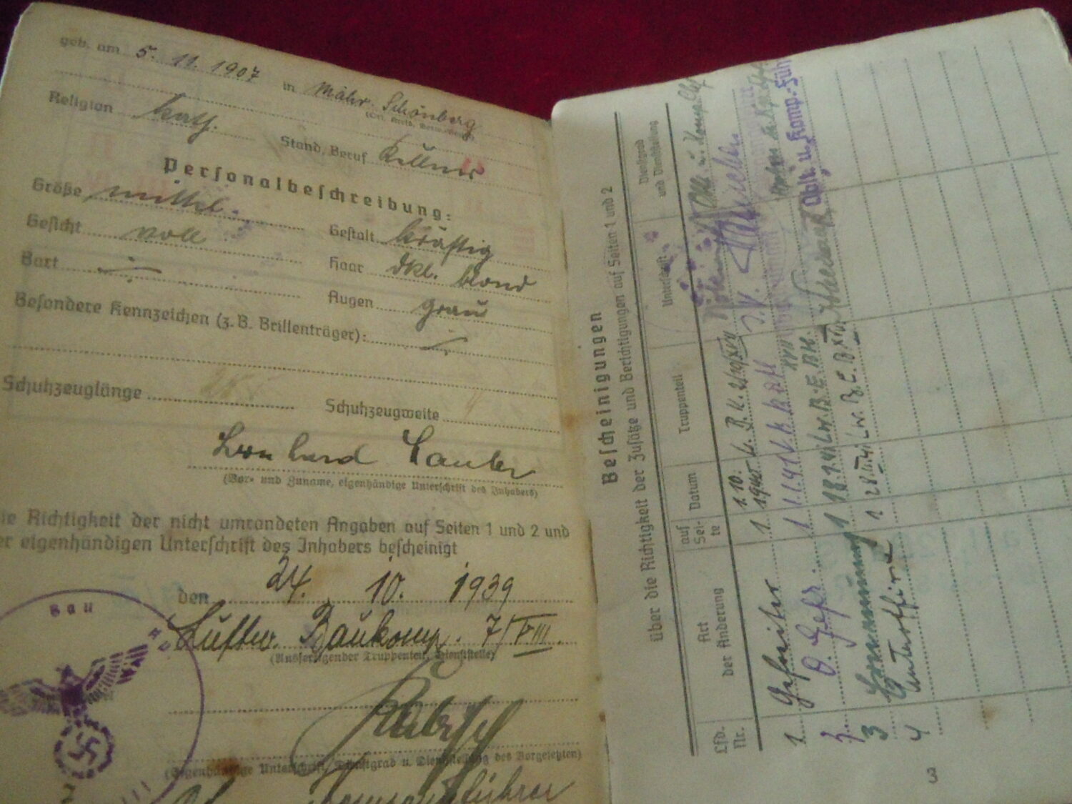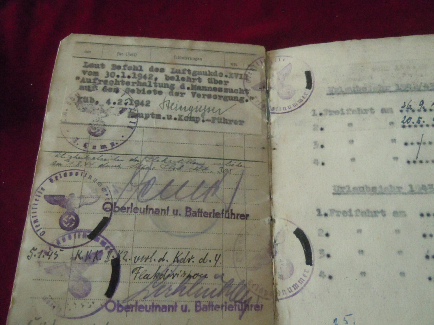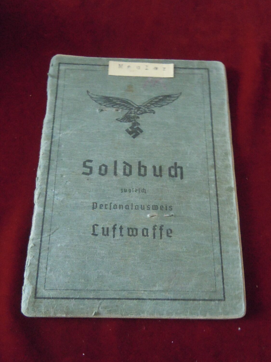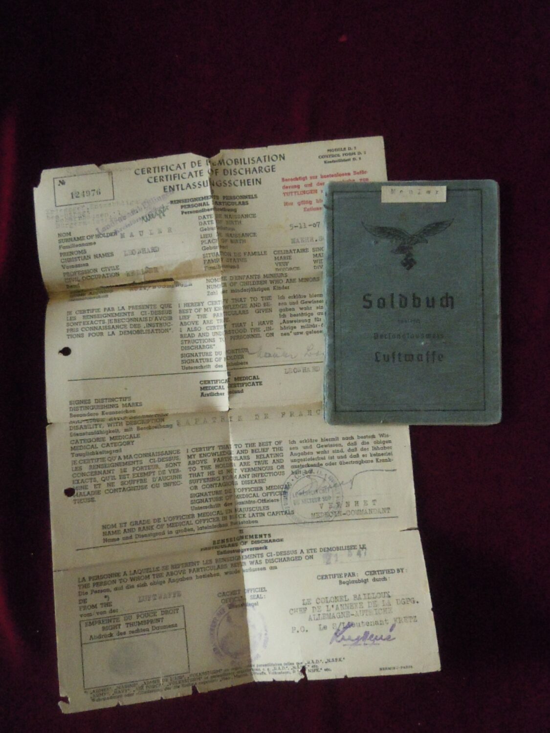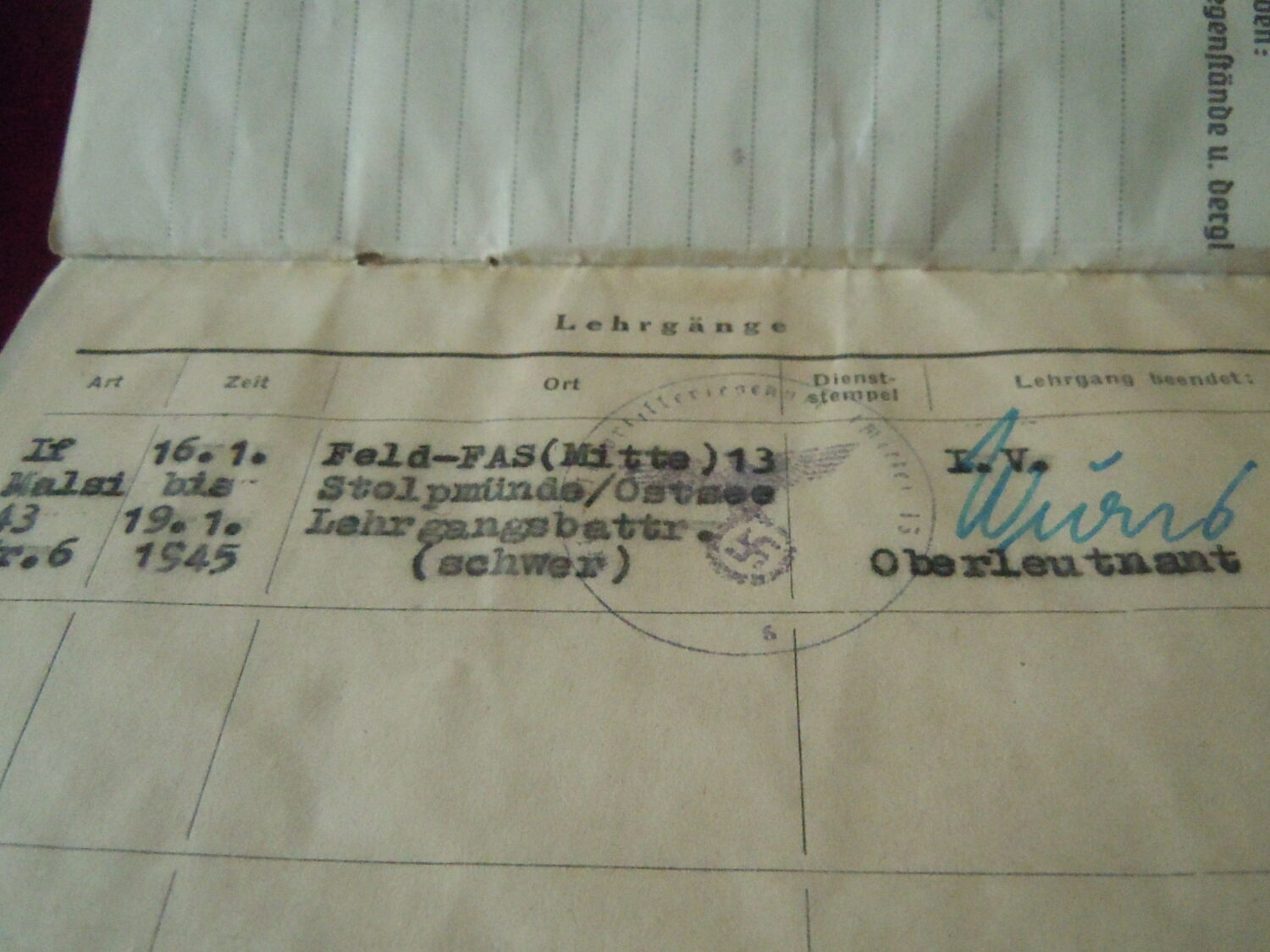 Soldbuch Luftwaffe au nom de Unteroffizier Leonhard Mauler. Schi.flak.Abt.394 su 19 janvier 1942 au 11 juin 1943 à Duisburg, Schw.Flak.Batterie.ZbV 5721 du 12 juin 1943 au 19 aout 1943, Schw.Flak.Abt.703 du 20 aout 1943 au 10 décembre 1943 à Duisburg, Kroaten batterie du 10 décembre 1943 au 15 septembre 1944 à Duisburg, Schw.Flak.Abt.244 du 15 septembre 1944 au 24 mars 1945 à Dusseldorf, Schw.Flak.Abt.472 du 25 mars 1945 au 4 avril 1945. Fait prisonnier dans la Poche de la Rhur. Un certificat de démobilisation accompagne le Soldbuch.