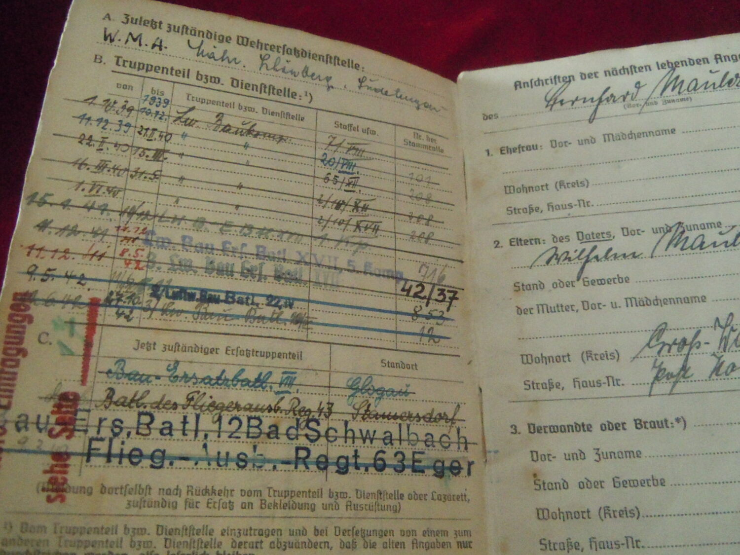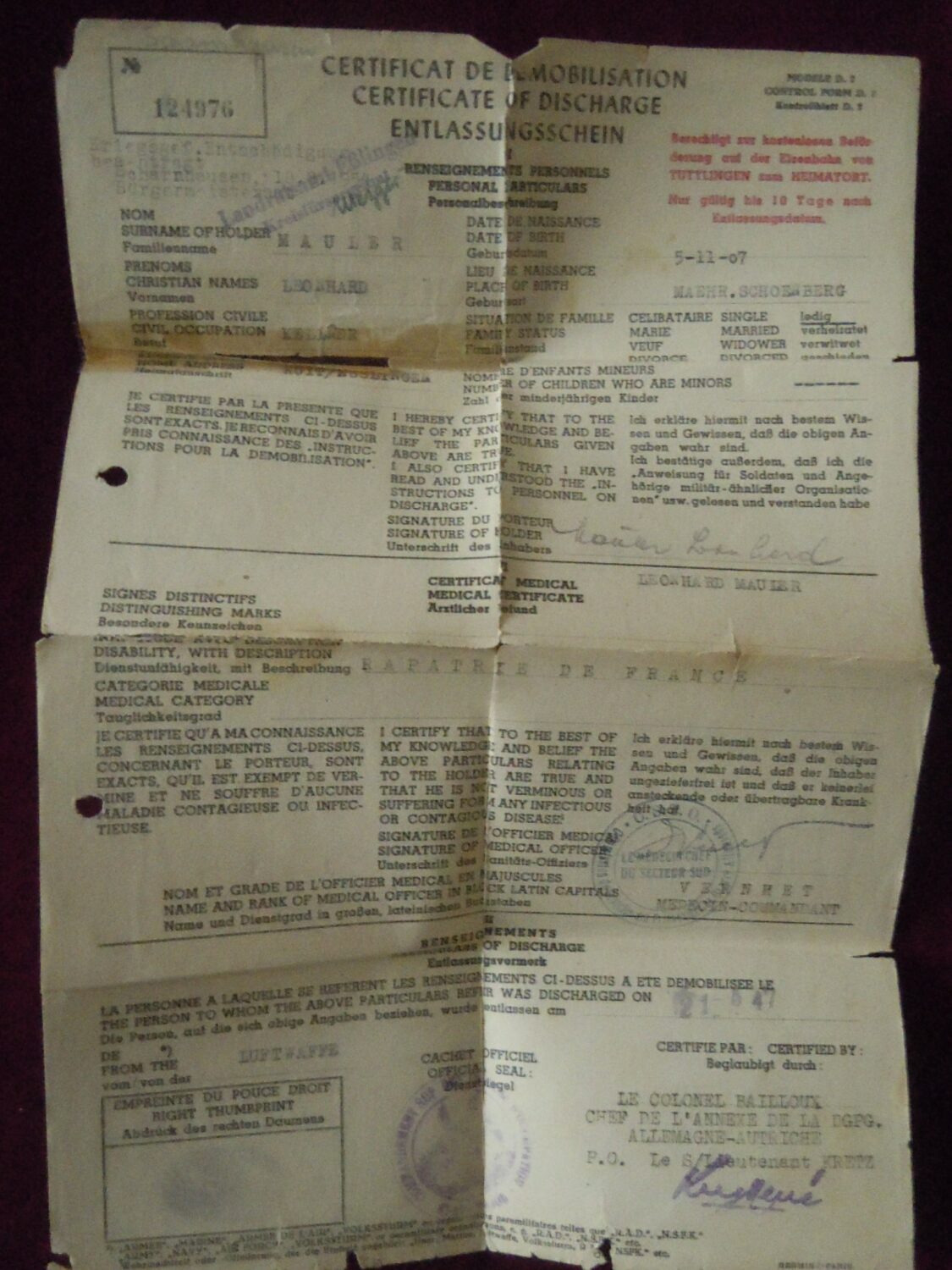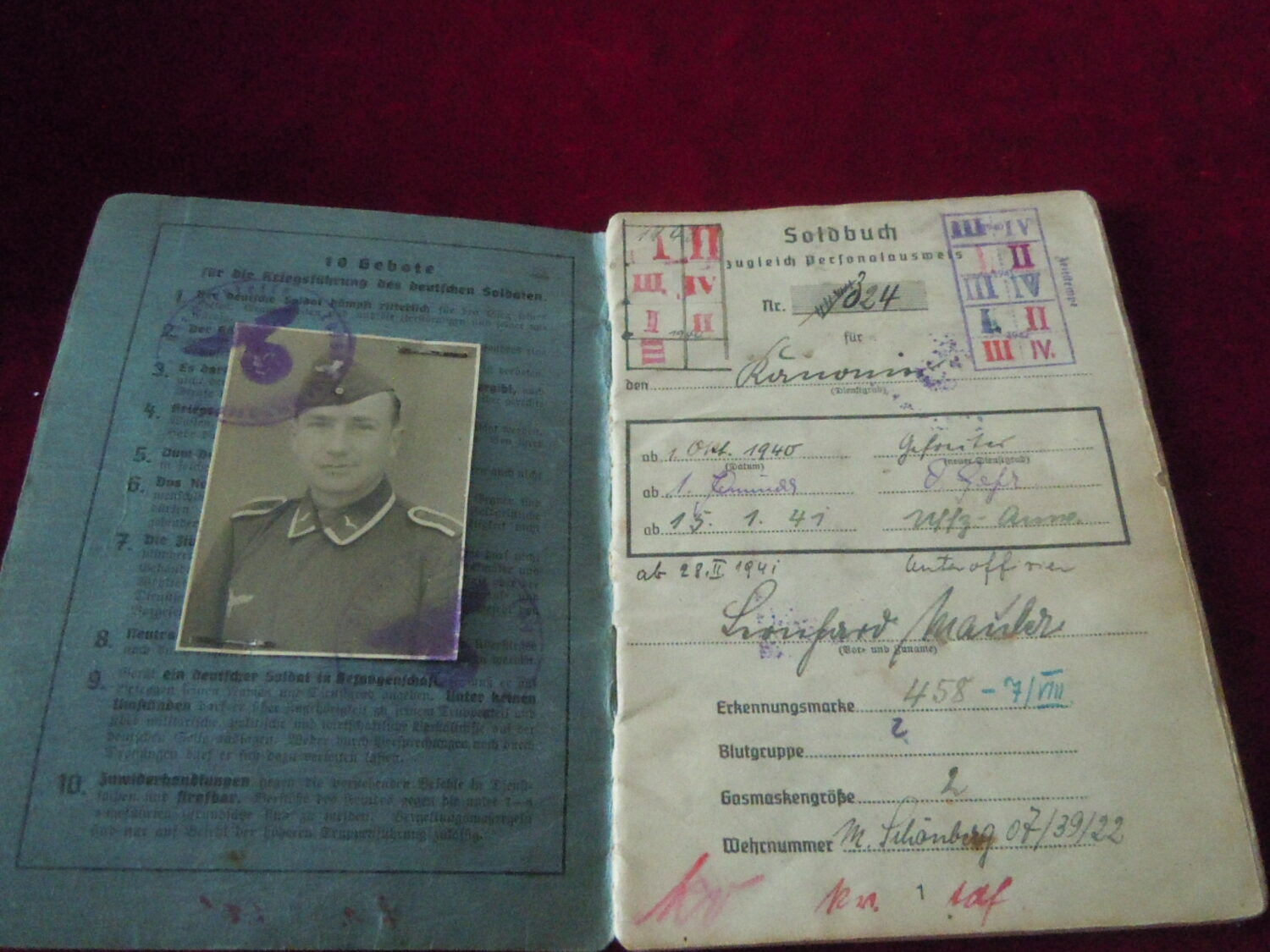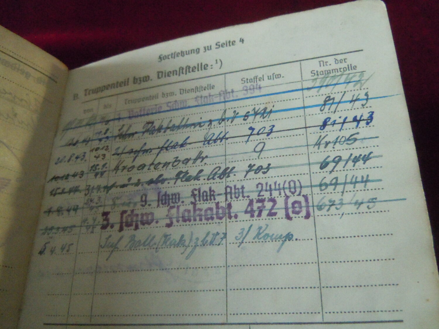 Soldbuch Luftwaffe au nom de Unteroffizier Leonhard Mauler. Schi.flak.Abt.394 su 19 janvier 1942 au 11 juin 1943 à Duisburg, Schw.Flak.Batterie.ZbV 5721 du 12 juin 1943 au 19 aout 1943, Schw.Flak.Abt.703 du 20 aout 1943 au 10 décembre 1943 à Duisburg, Kroaten batterie du 10 décembre 1943 au 15 septembre 1944 à Duisburg, Schw.Flak.Abt.244 du 15 septembre 1944 au 24 mars 1945 à Dusseldorf, Schw.Flak.Abt.472 du 25 mars 1945 au 4 avril 1945. Fait prisonnier dans la Poche de la Rhur. Un certificat de démobilisation accompagne le Soldbuch.