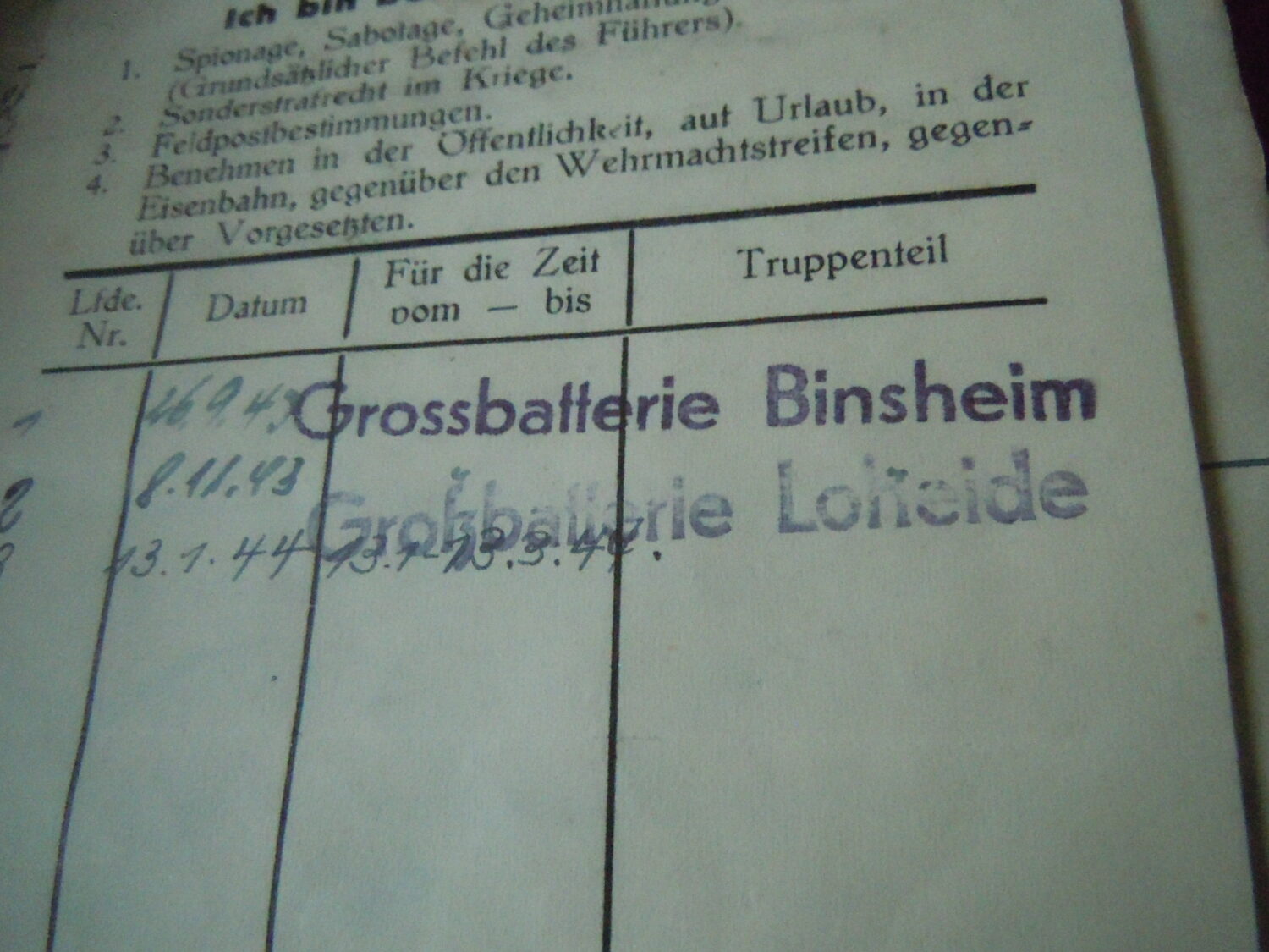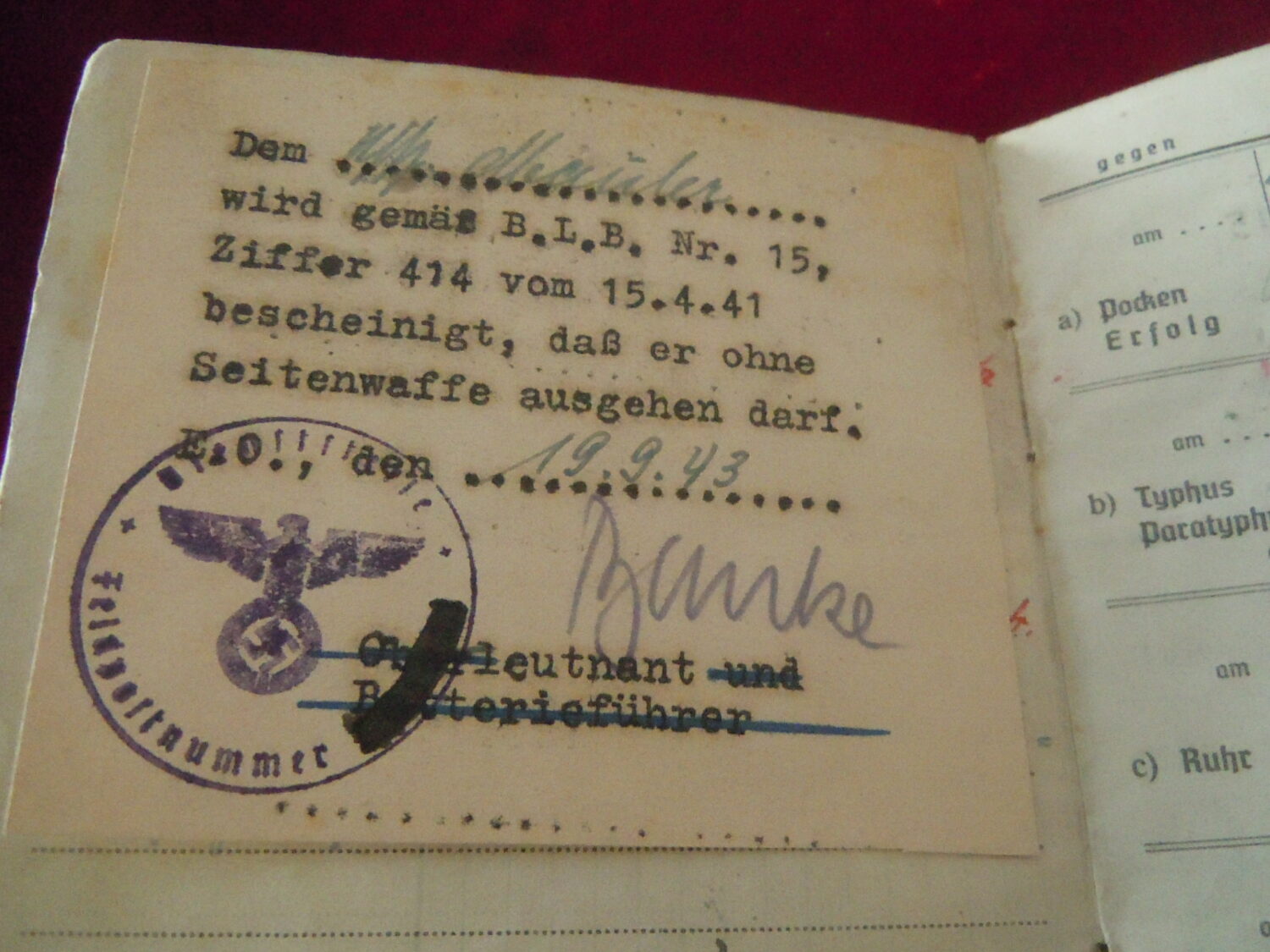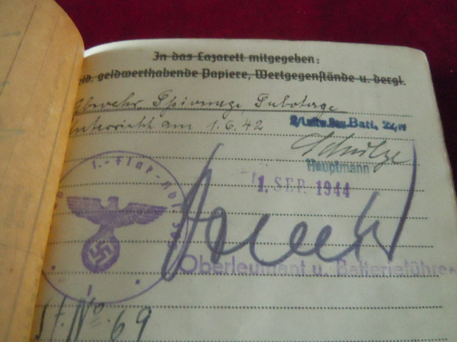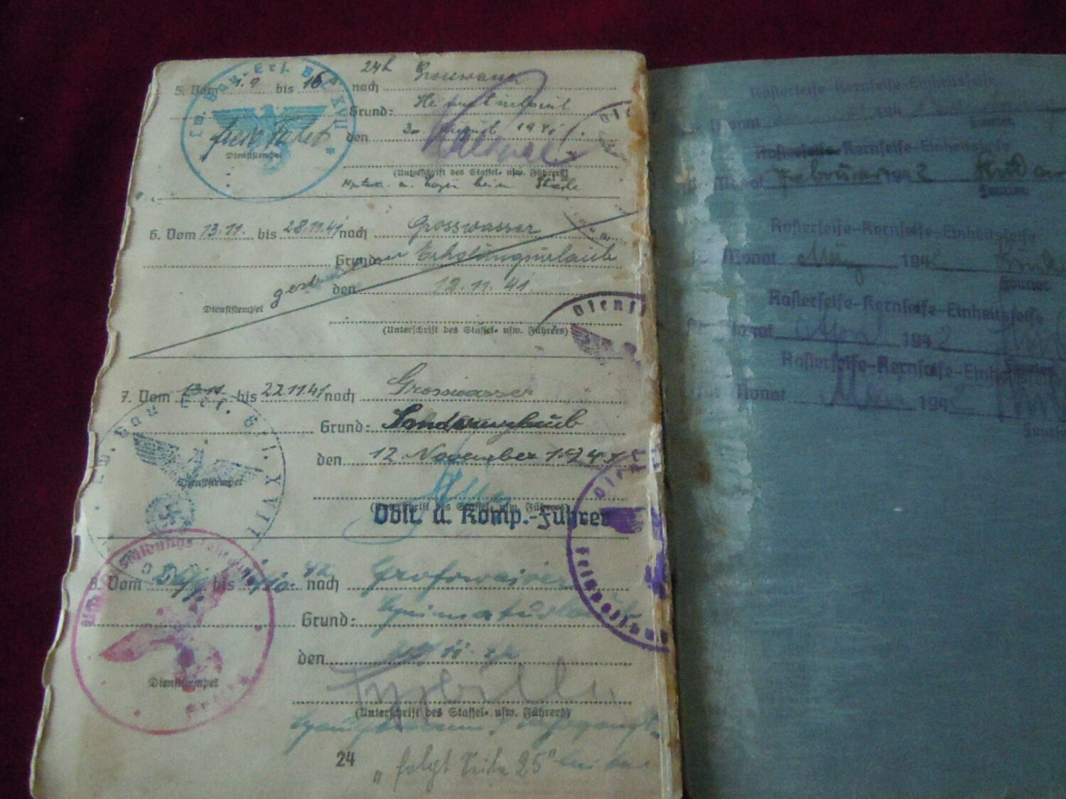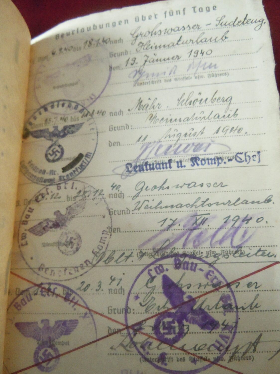 Soldbuch Luftwaffe au nom de Unteroffizier Leonhard Mauler. Schi.flak.Abt.394 su 19 janvier 1942 au 11 juin 1943 à Duisburg, Schw.Flak.Batterie.ZbV 5721 du 12 juin 1943 au 19 aout 1943, Schw.Flak.Abt.703 du 20 aout 1943 au 10 décembre 1943 à Duisburg, Kroaten batterie du 10 décembre 1943 au 15 septembre 1944 à Duisburg, Schw.Flak.Abt.244 du 15 septembre 1944 au 24 mars 1945 à Dusseldorf, Schw.Flak.Abt.472 du 25 mars 1945 au 4 avril 1945. Fait prisonnier dans la Poche de la Rhur. Un certificat de démobilisation accompagne le Soldbuch.