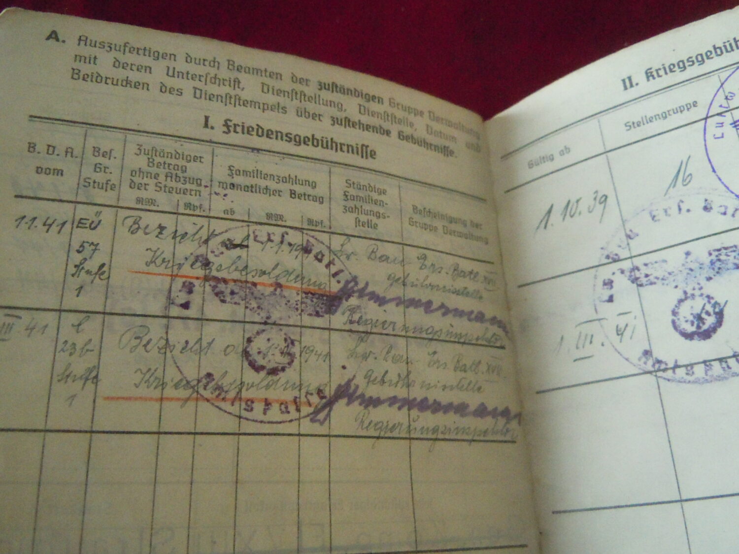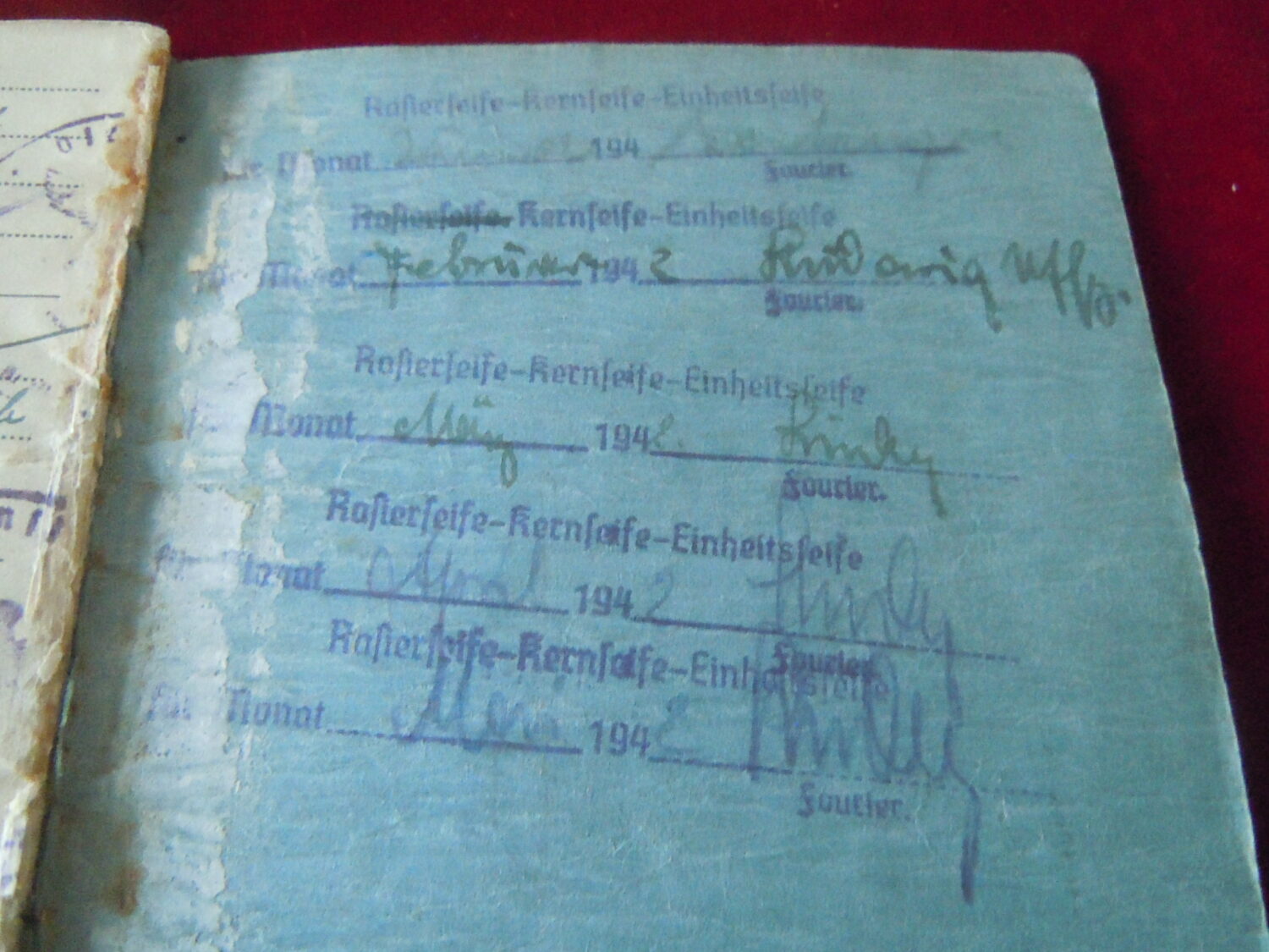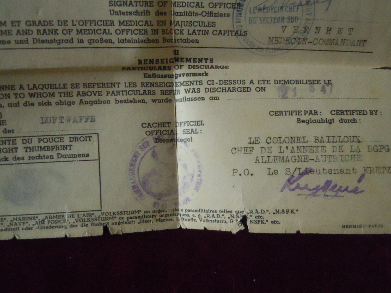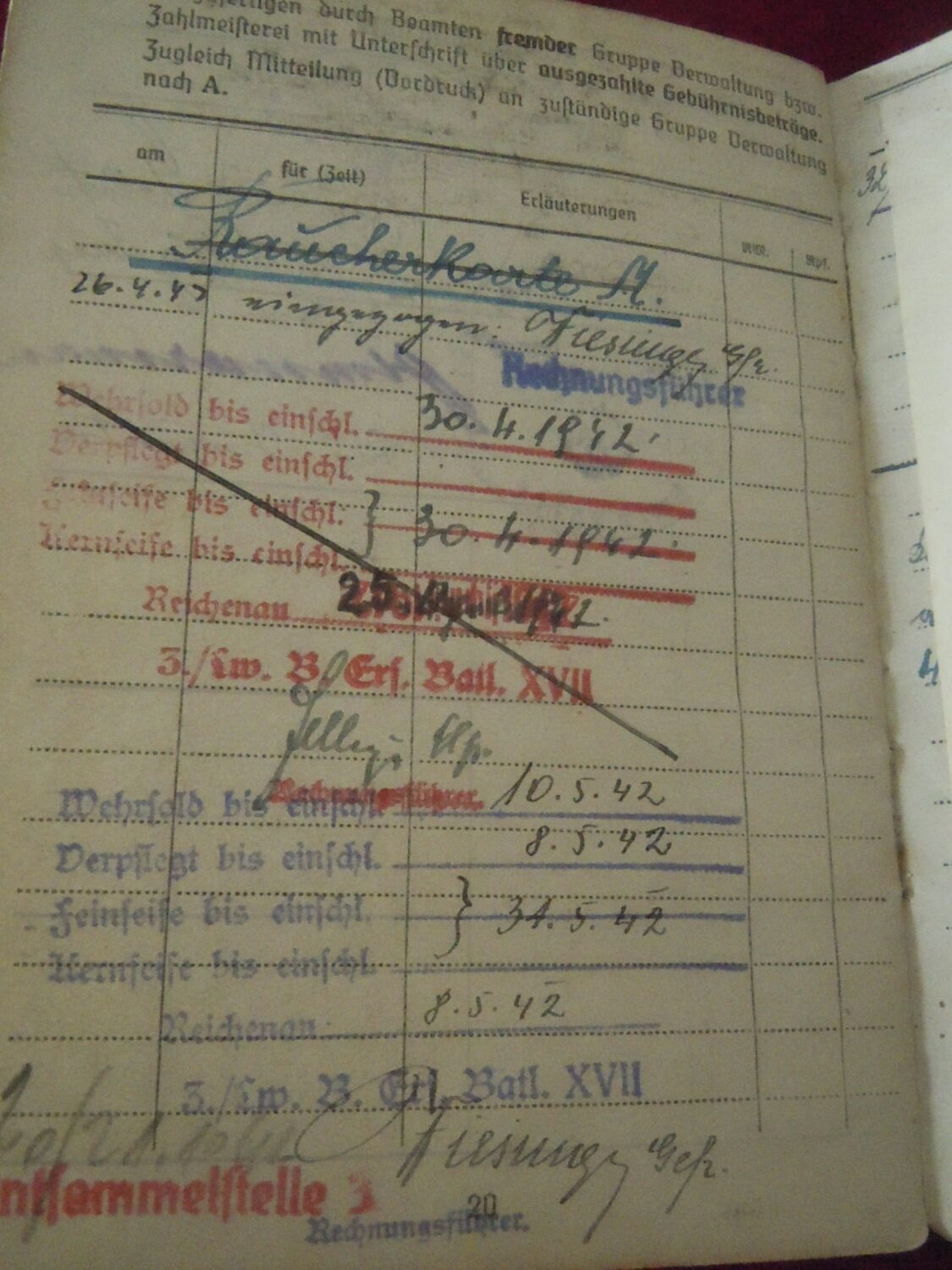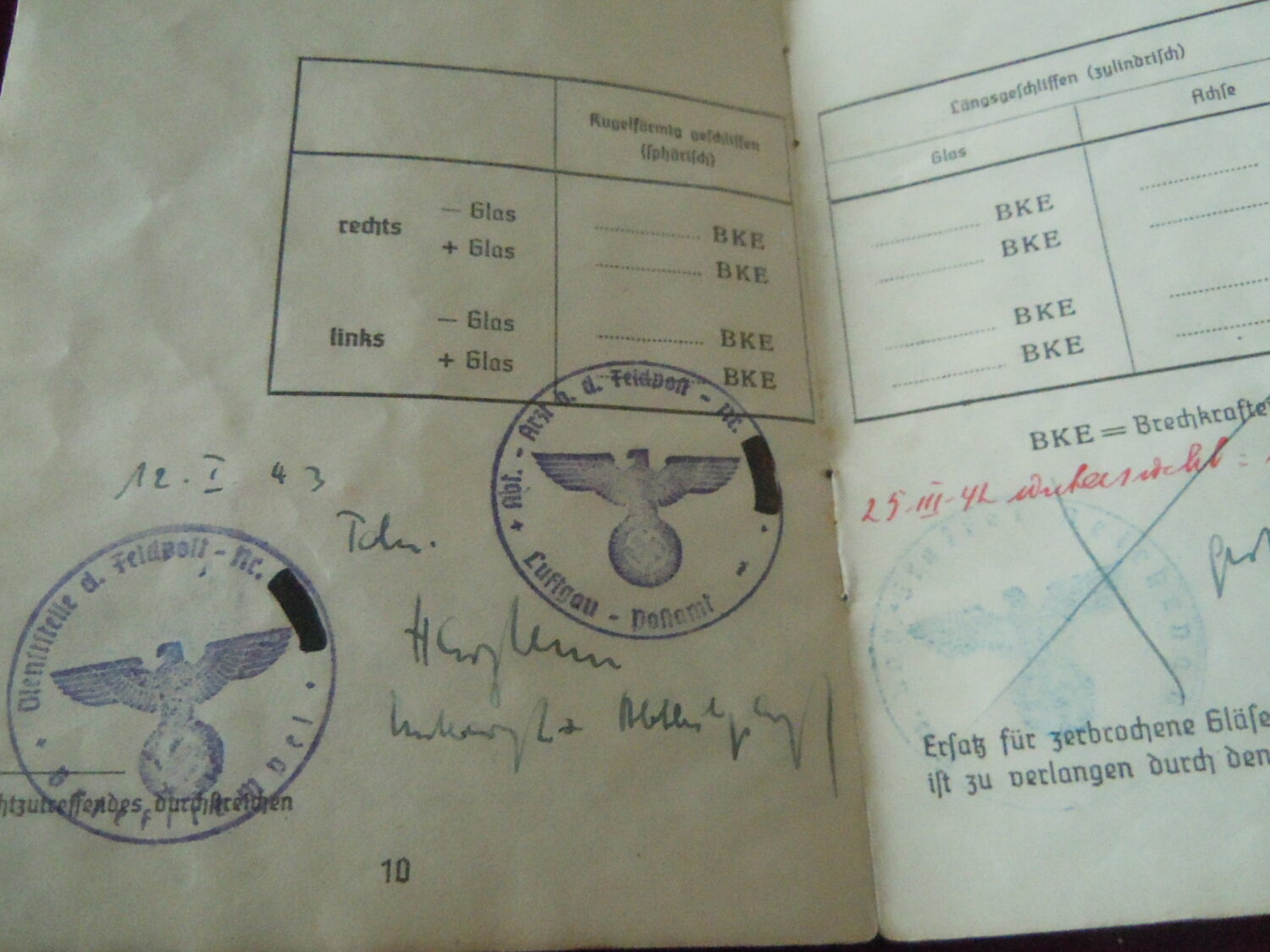 Soldbuch Luftwaffe au nom de Unteroffizier Leonhard Mauler. Schi.flak.Abt.394 su 19 janvier 1942 au 11 juin 1943 à Duisburg, Schw.Flak.Batterie.ZbV 5721 du 12 juin 1943 au 19 aout 1943, Schw.Flak.Abt.703 du 20 aout 1943 au 10 décembre 1943 à Duisburg, Kroaten batterie du 10 décembre 1943 au 15 septembre 1944 à Duisburg, Schw.Flak.Abt.244 du 15 septembre 1944 au 24 mars 1945 à Dusseldorf, Schw.Flak.Abt.472 du 25 mars 1945 au 4 avril 1945. Fait prisonnier dans la Poche de la Rhur. Un certificat de démobilisation accompagne le Soldbuch.