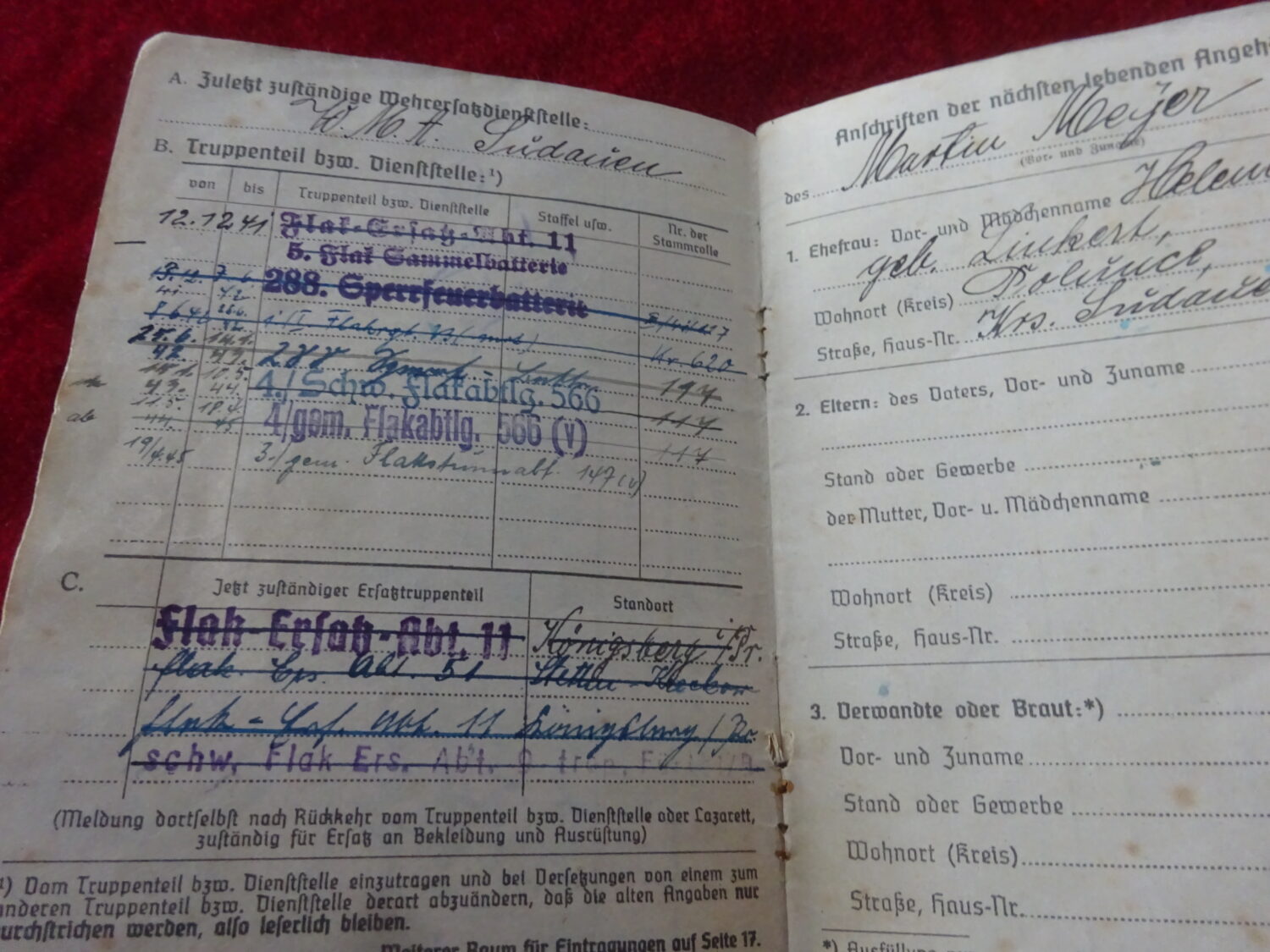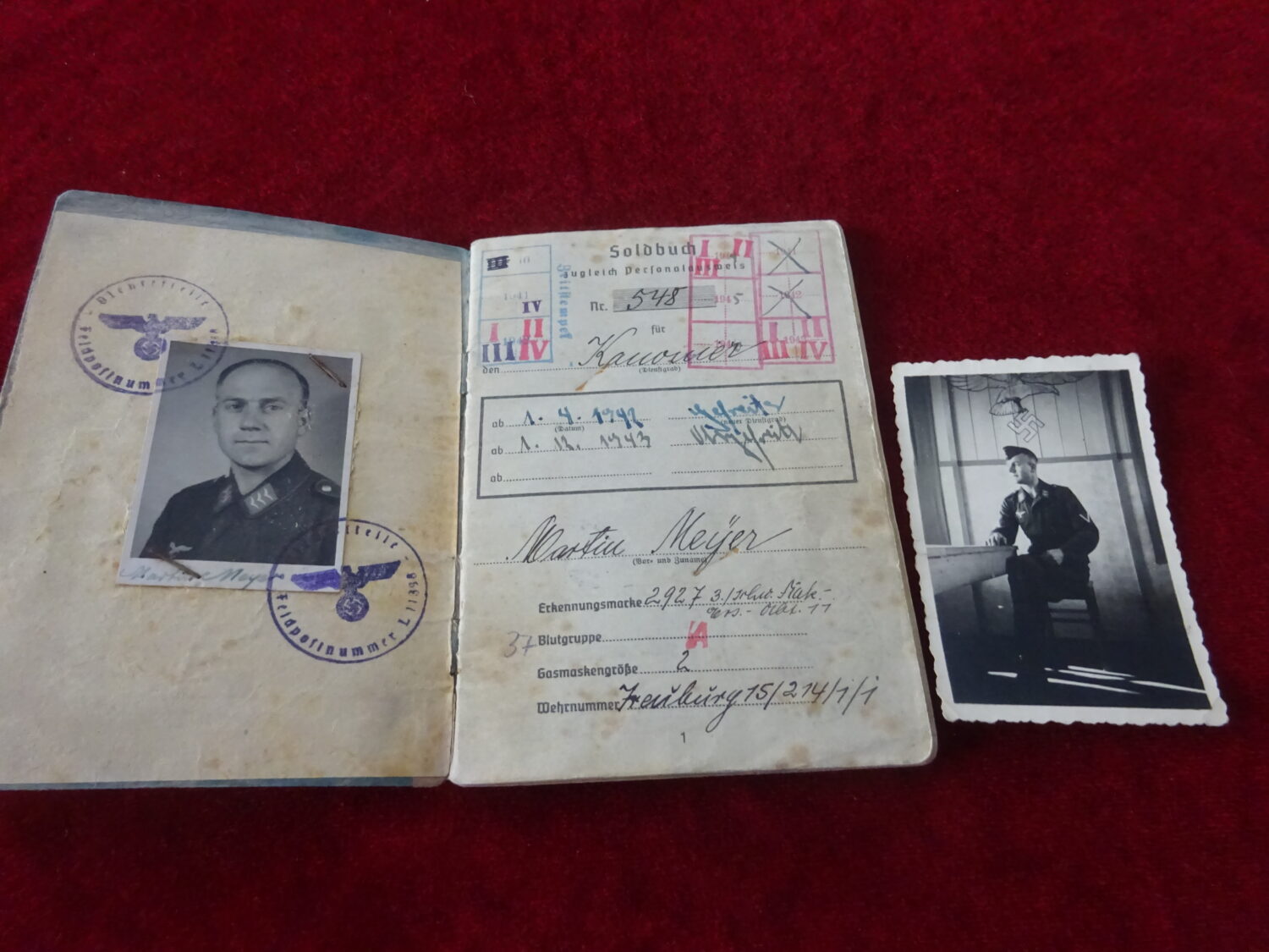 Soldbuch Lufwaffe au nom de Martin Meyer qui terminera la guerre au grade de Obergefreiter. Affectations: Flak-Ersatz art.11 à Konigsberg (12/12/1941), 288. Sperrfeuerbatterie (13-12-1941 au 07-06-1942), 1/Flakrgt 13 (mot) Heeres Gruppe Nord, front de la luge (08/06/1942 au 25/06-/1942), 288. Speerfeuerbatterie (25/061942 au 14/01/1943), 4/Schw.flakabtlg.566 (14/01/1943 au 10/05/1944), 4/Gem.flakabt 566(12/05/1944 au 18/04/1945), 3/gem.flaksturmbat 147 (19/04/1945 au 02/05/1945). Bon état