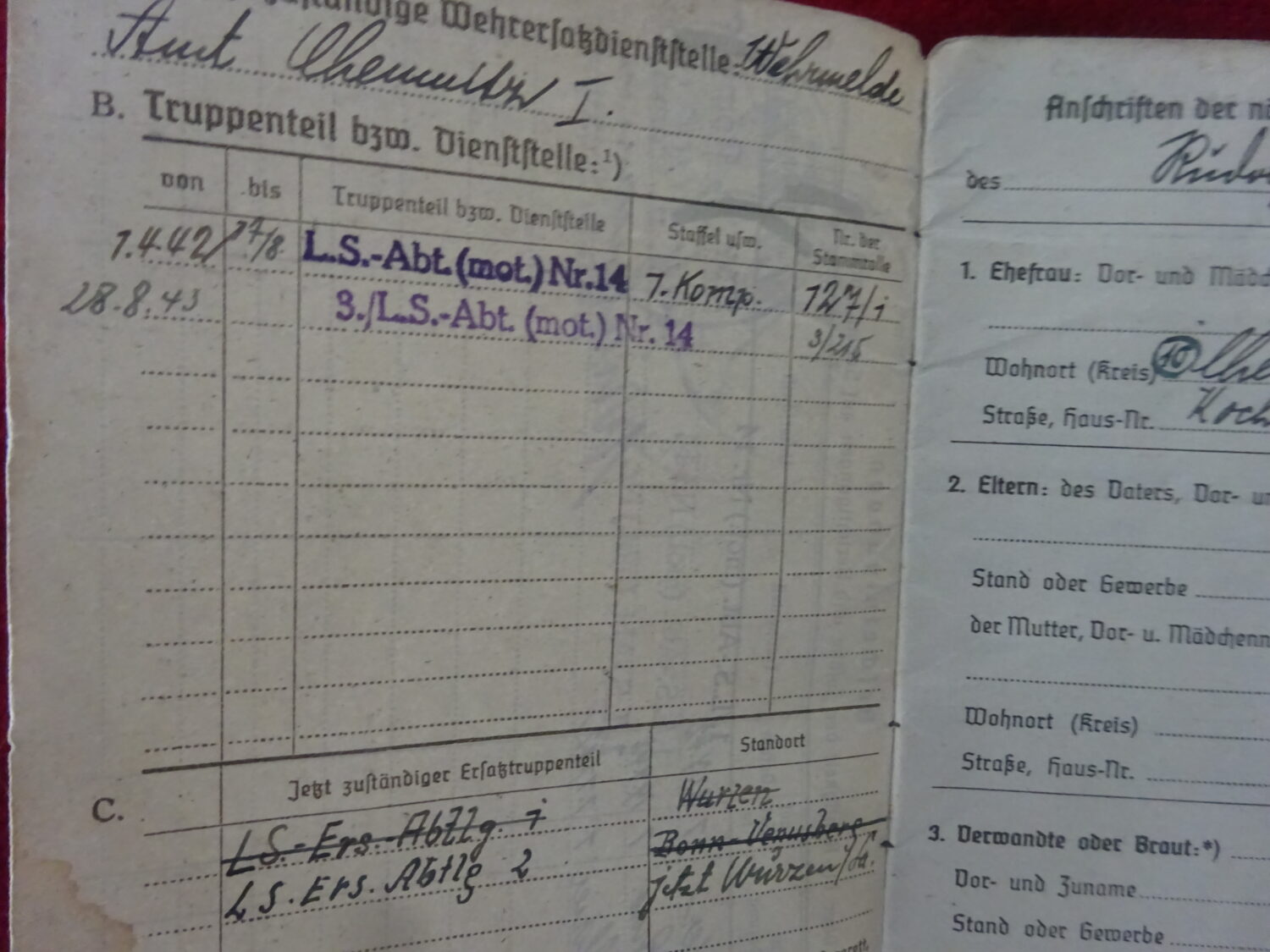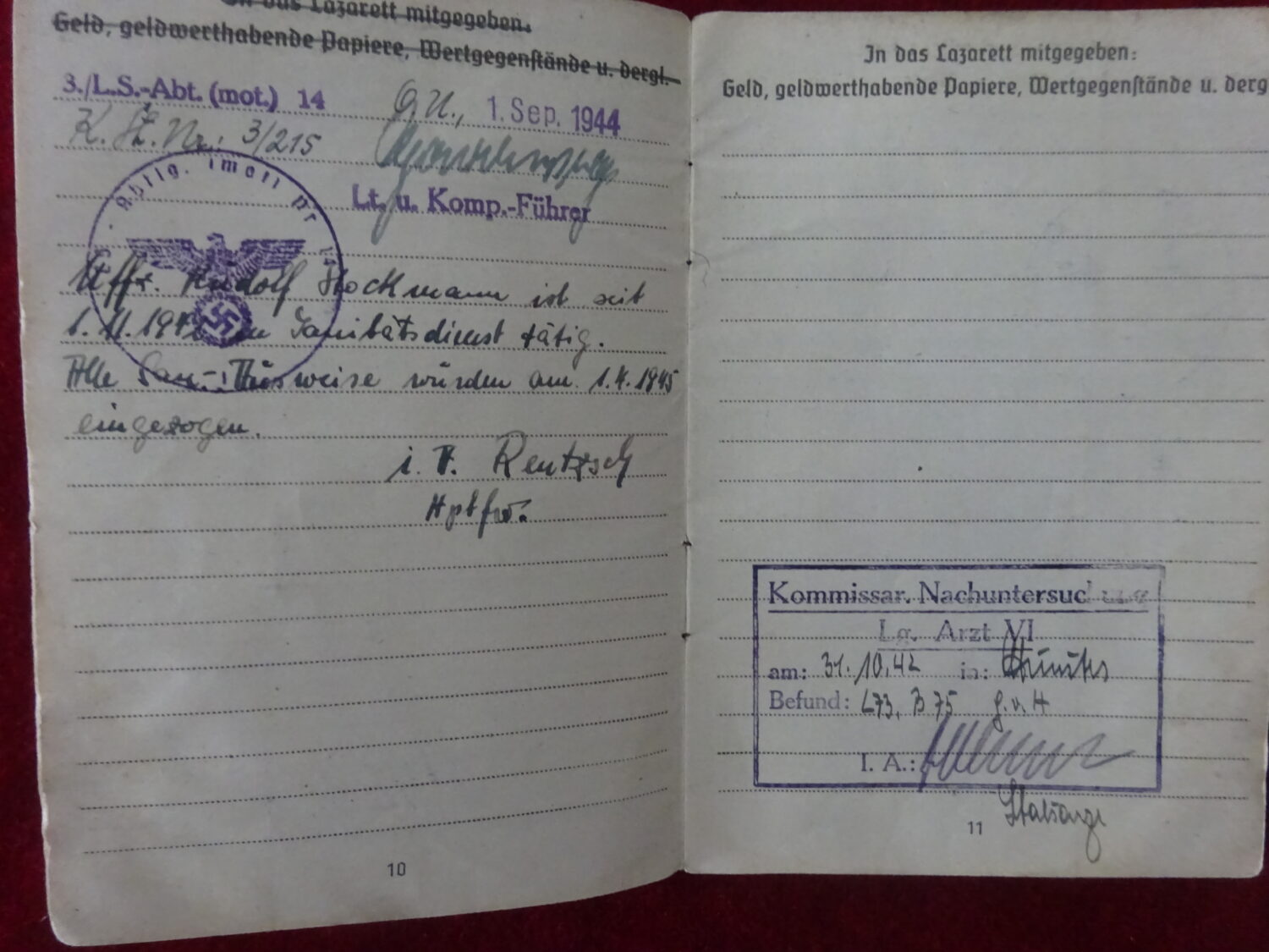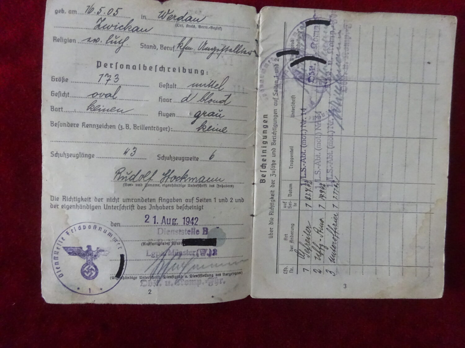 Soldbuch Luftwaffe au nom de Rudolf Stockmann (Unteroffizier). Le soldbuch est ouvert le 21 aout 1942 à la LGPA Munster (W) 2. Il est affecté au LS-Abt (Mot.) Nr.14 7 KP, unité d’assistance aux bombardements et stationné à Wurzen dans la Saxe à l’est de Leipzig. Le 1er novembre 1942 il est affecté dans cette unité au service sanitaire. Le 28 aout 1943, il est envoyé au 3/L.S.Abt (mot.) Nr.14 toujours dans le secteur aérien de Wurzen. Il y reste jusqu’à la fin de la guerre.