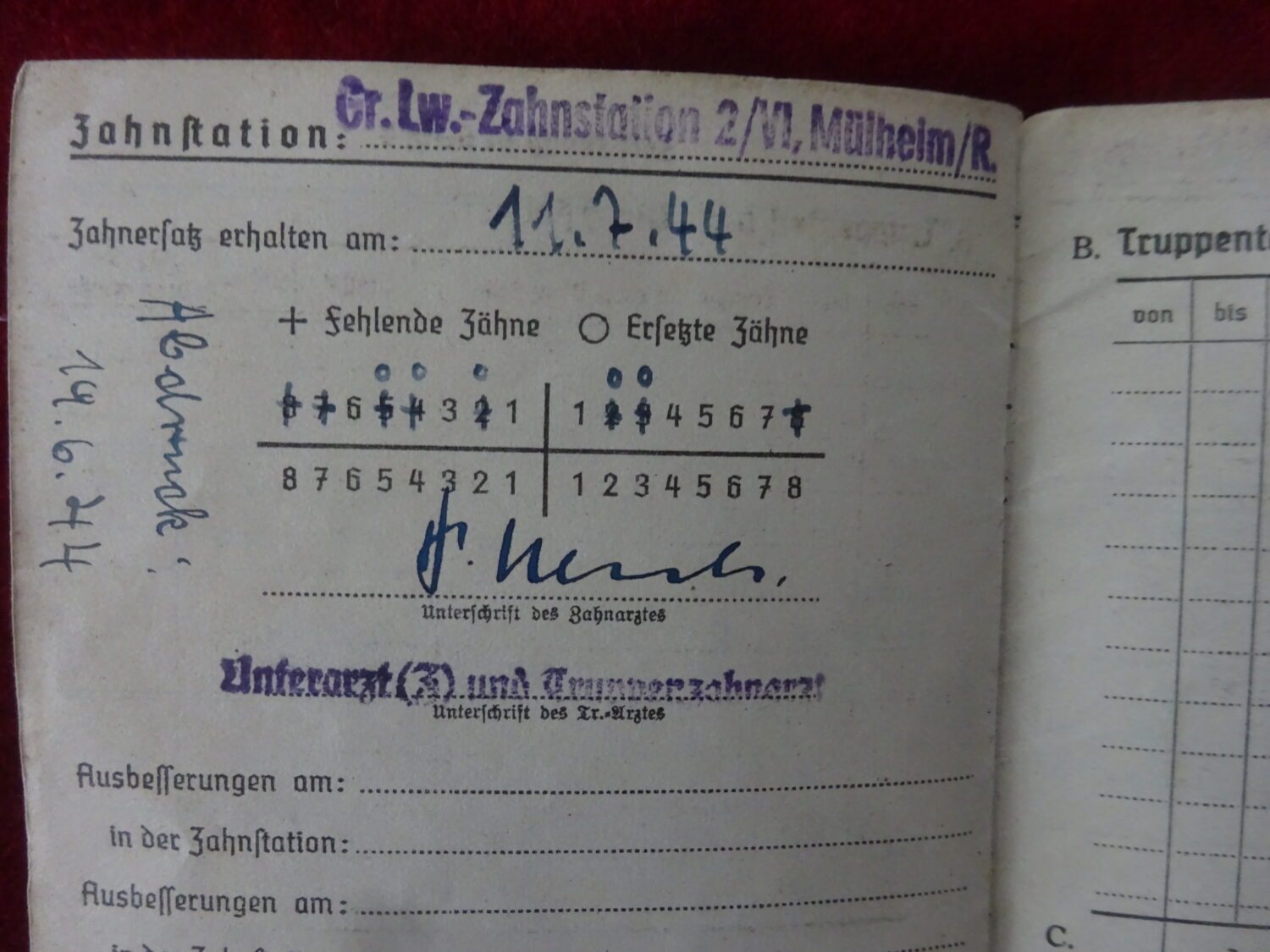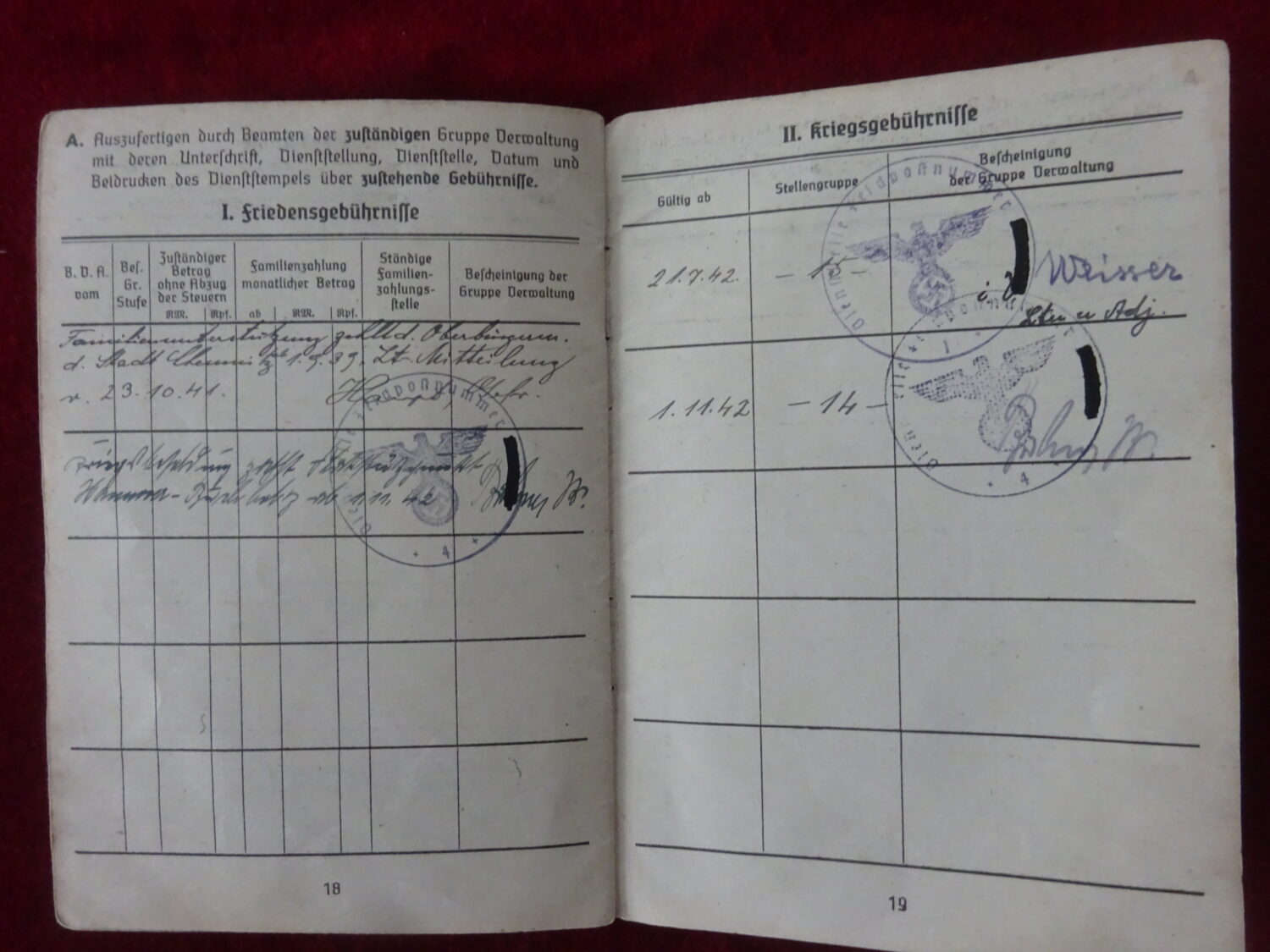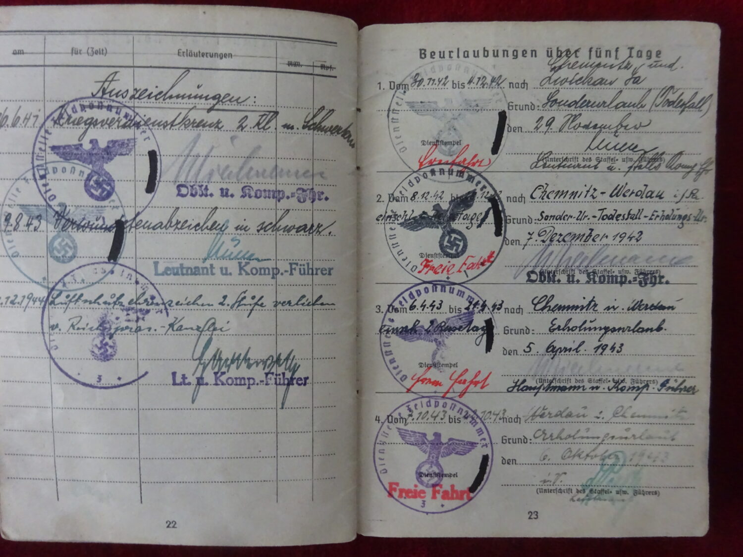 Soldbuch Luftwaffe au nom de Rudolf Stockmann (Unteroffizier). Le soldbuch est ouvert le 21 aout 1942 à la LGPA Munster (W) 2. Il est affecté au LS-Abt (Mot.) Nr.14 7 KP, unité d’assistance aux bombardements et stationné à Wurzen dans la Saxe à l’est de Leipzig. Le 1er novembre 1942 il est affecté dans cette unité au service sanitaire. Le 28 aout 1943, il est envoyé au 3/L.S.Abt (mot.) Nr.14 toujours dans le secteur aérien de Wurzen. Il y reste jusqu’à la fin de la guerre.