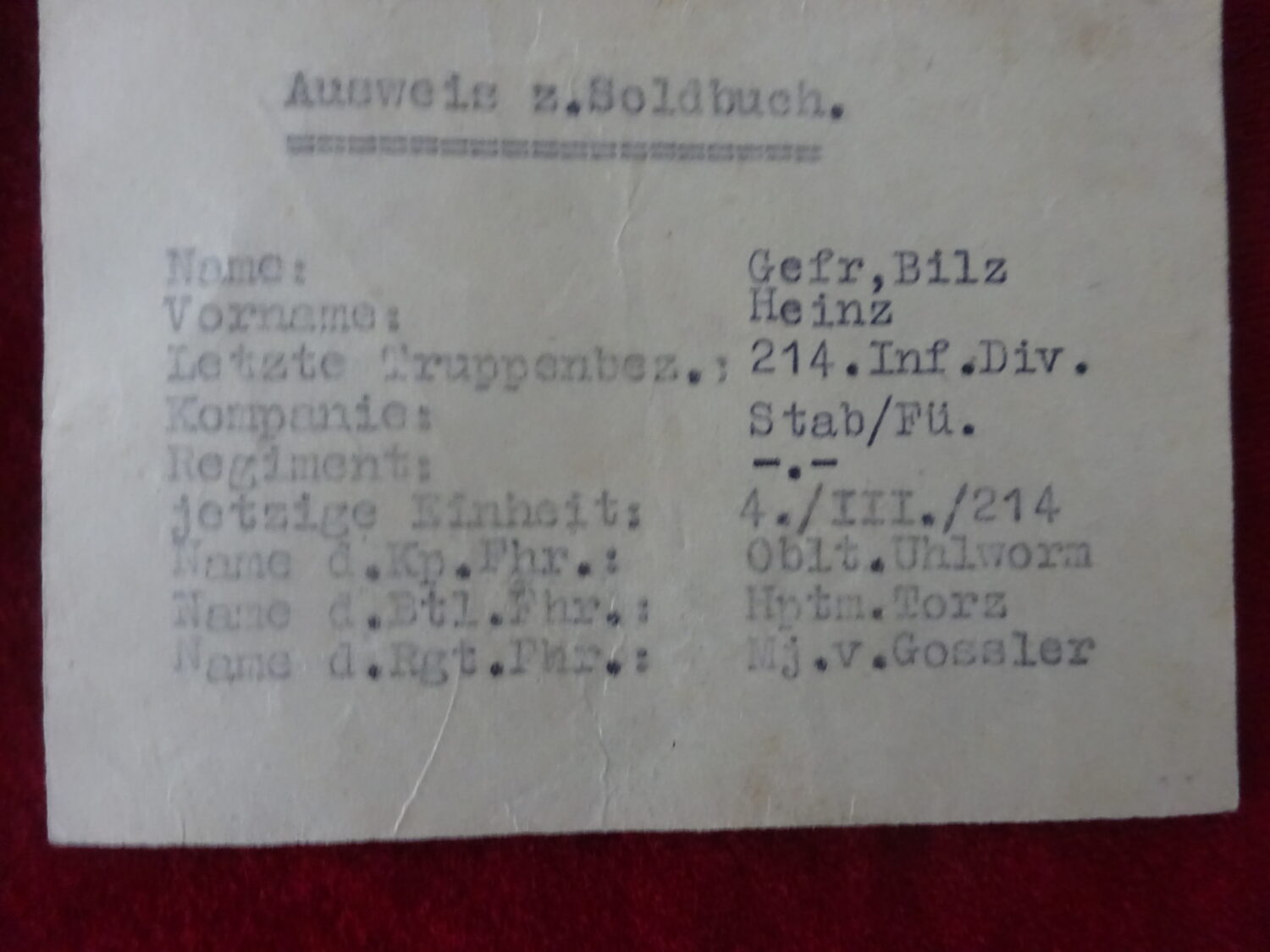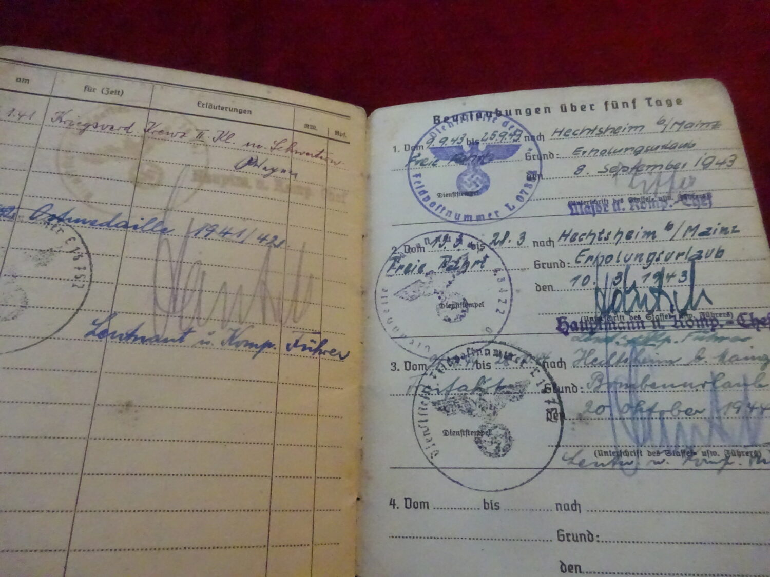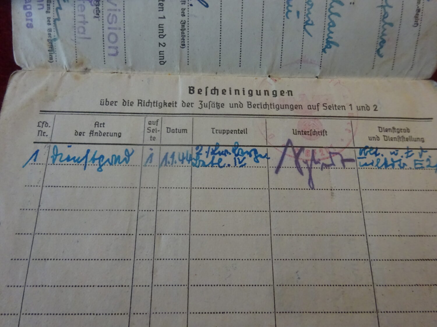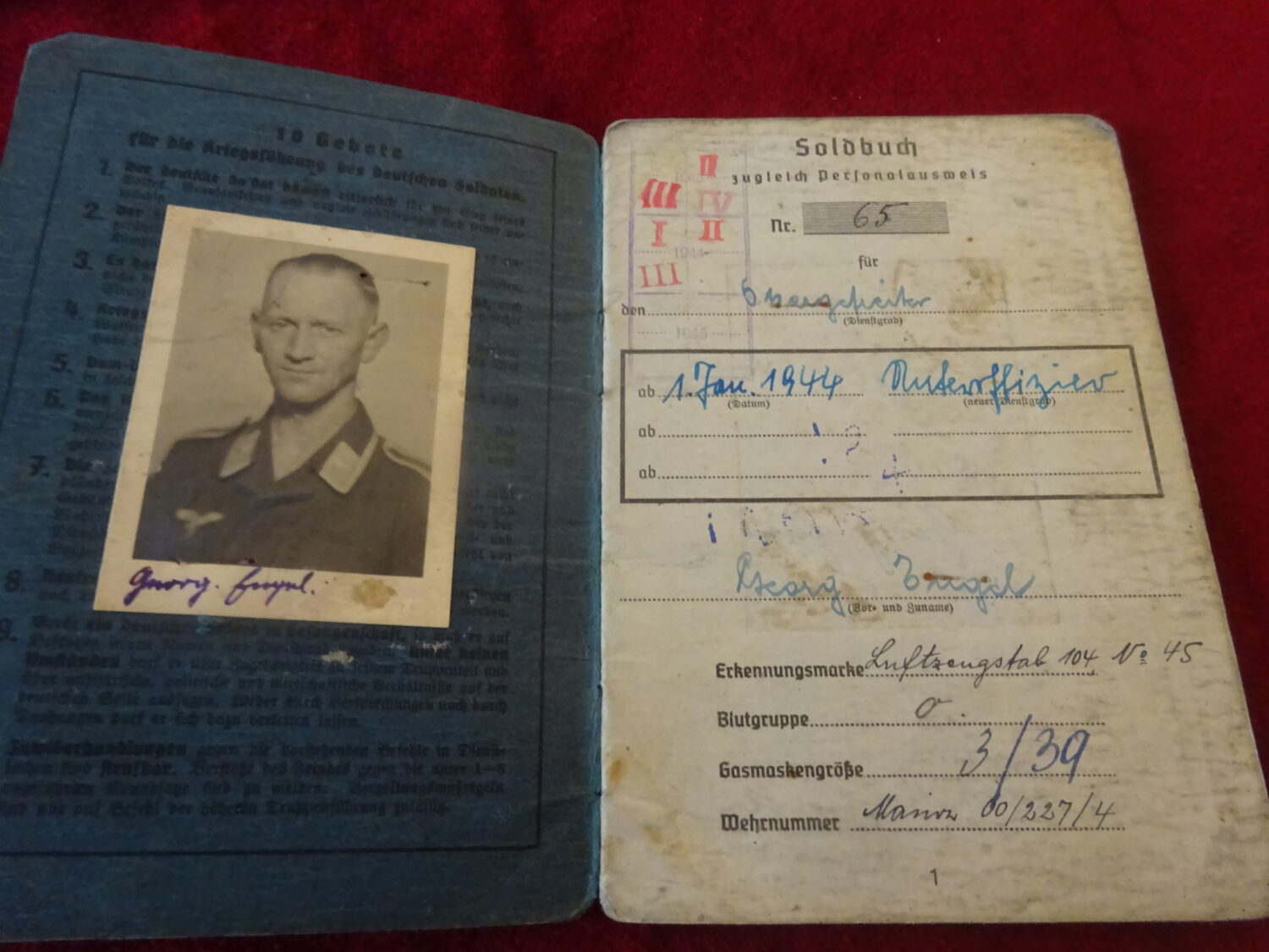 Soldbuch Luftwaffe au nom de Georg Engel ouvert en avril 1943 à la 21 Flakdivision, unité de défense aérienne du secteur Rhein/Main. Il s’agit d’un document de remplacement, le premier ayant été perdu ou dégradé. Georg Engel est ensuite affecté au mois de juin 1943 au Luftzeugstab, unité d’approvisionnement de la Luftwaffe et basée à Seyring beh Wien. Le 1er septembre 1943, il est affecté à la 2.Lw.Berge.Btl.IV (unité de montagne de la Luftwaffe) dépendant des Luftgau VI et XIV. Le 2 novembre 1944 nouvelle affectation au Flieger Ersatz Btl XVII (secteur défensif aérien de Vienne en Autriche). Le 5 décembre 1944 et jusqu’à la fin de la guerre, il rejoint le Kraftfahrausbildungstelle der LW 12 situé dans la ville de Furth en Bavière. Il se rend avec son unité aux troupes alliées en mai 1945.